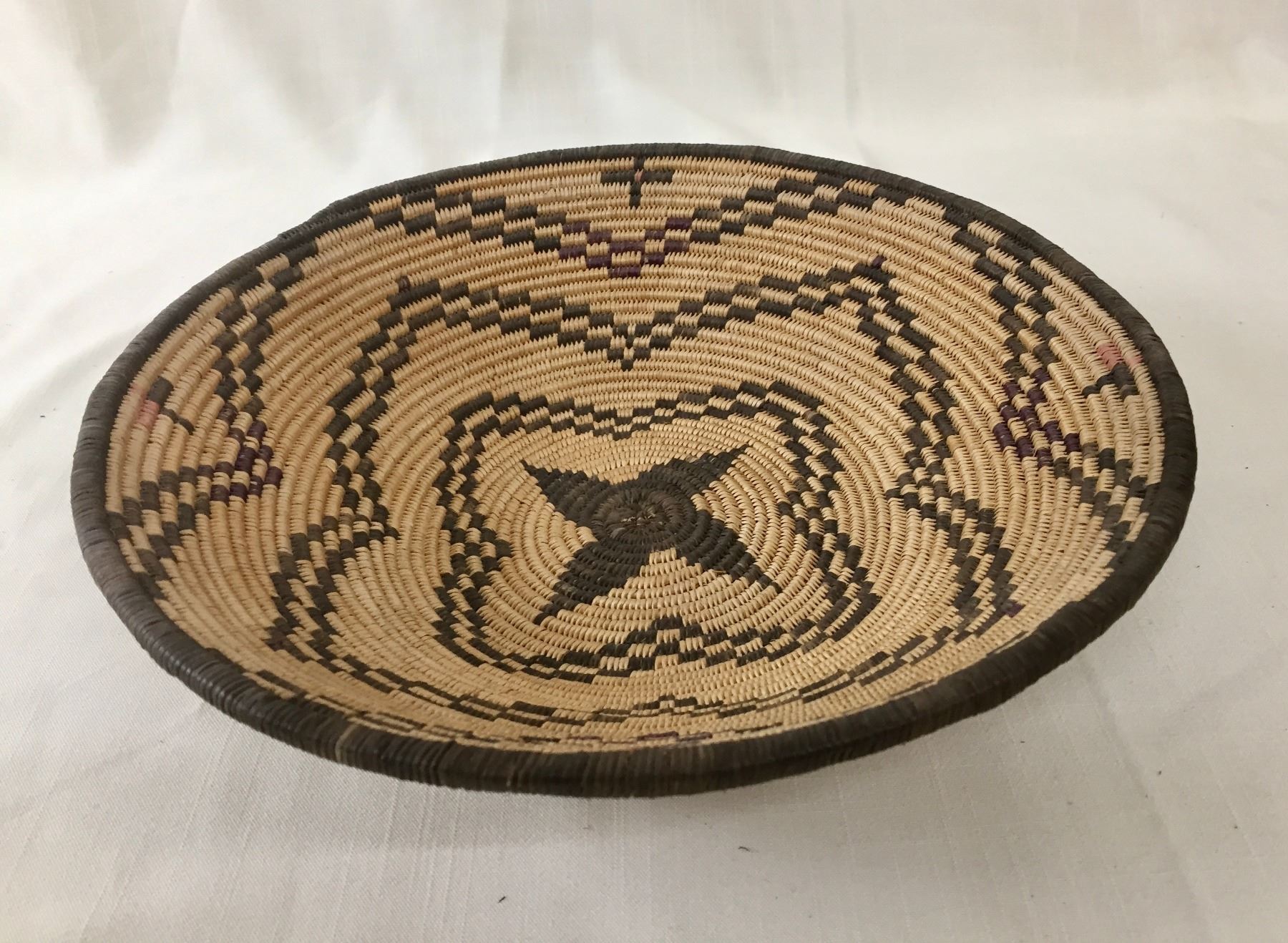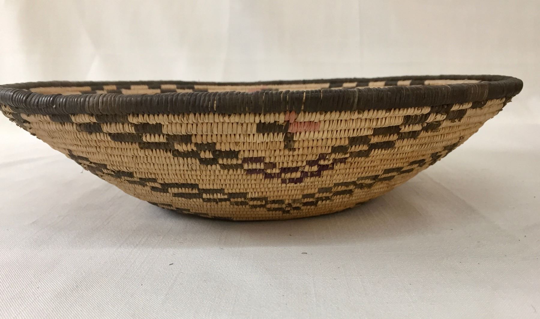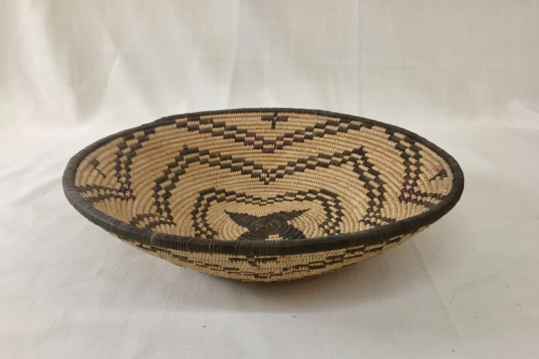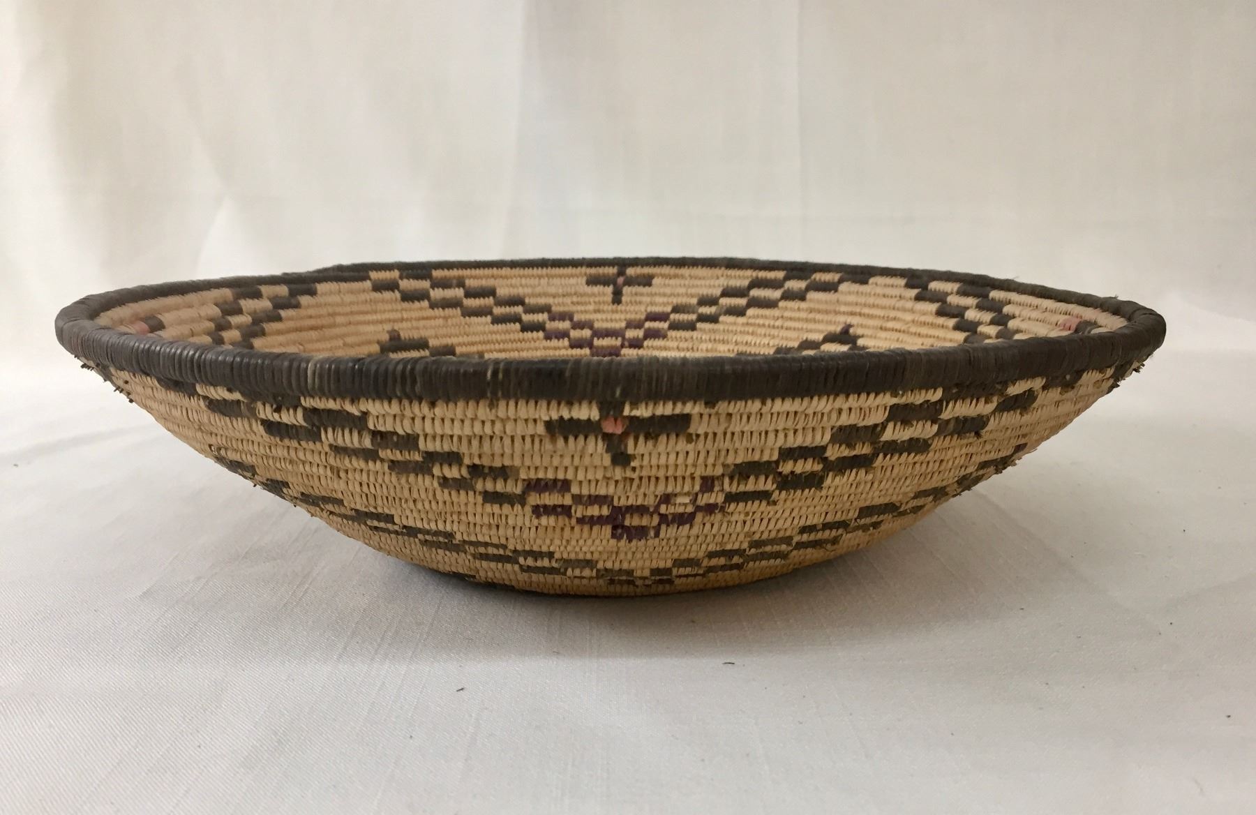 Description: For sale in this lot is a great, old, polychrome, Apache basket featuring geometric designs. Maker: Unknown Apache weaver. Approx. Age: Circa early to mid-century. Size: 11-3/4”w x 2-7/8” deep. Condition: Good for its age, normal wear expected. Please look closely at the pictures - they are an important part of our description. Shipping: There will be a $8 handling / packaging fee for shipping this lot. The actual cost of postage will be added on top of that.