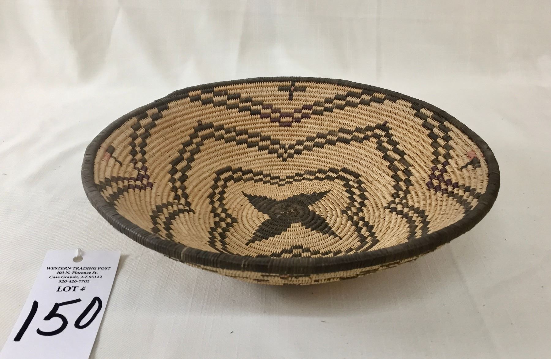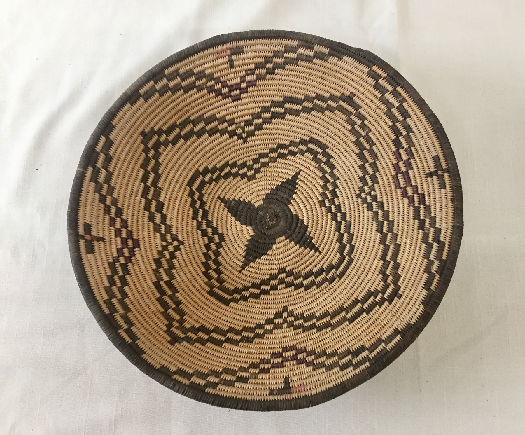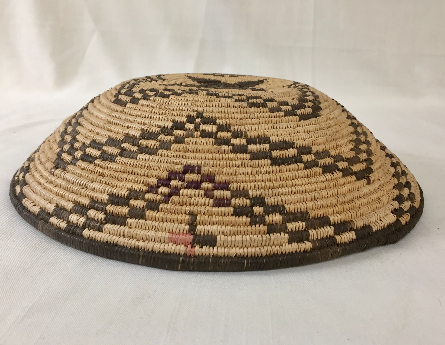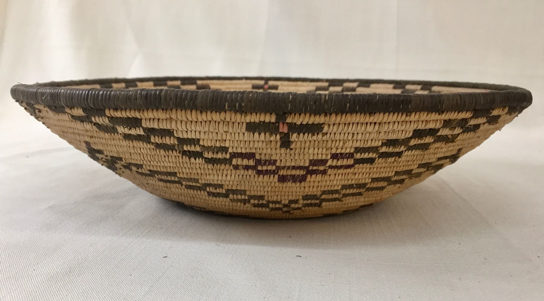 Description: For sale in this lot is a great, old, polychrome, Apache basket featuring geometric designs. Maker: Unknown Apache weaver. Approx. Age: Circa early to mid-century. Size: 11-3/4”w x 2-7/8” deep. Condition: Good for its age, normal wear expected. Please look closely at the pictures - they are an important part of our description. Shipping: There will be a $8 handling / packaging fee for shipping this lot. The actual cost of postage will be added on top of that.