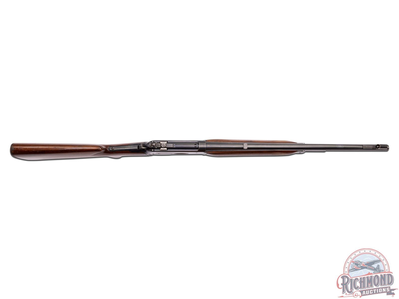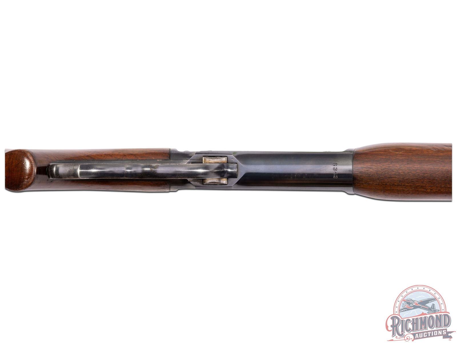 Manufactured in 1936 with all clear and standard Winchester roll marks and proof marks. Features a carbine 20" blued barrel hooded ramp blade front sight with brass bead and bolt mounted rear adjustable peep sight. Blued receiver with side loading gate. Smooth walnut long tang stock with pistol grip. Fitted with a factory checkered metal butt plate. LOP: 13-1/4". CALIBER: 348 WCF. S/N: 6343. FFL STATUS: Curio & Relic.