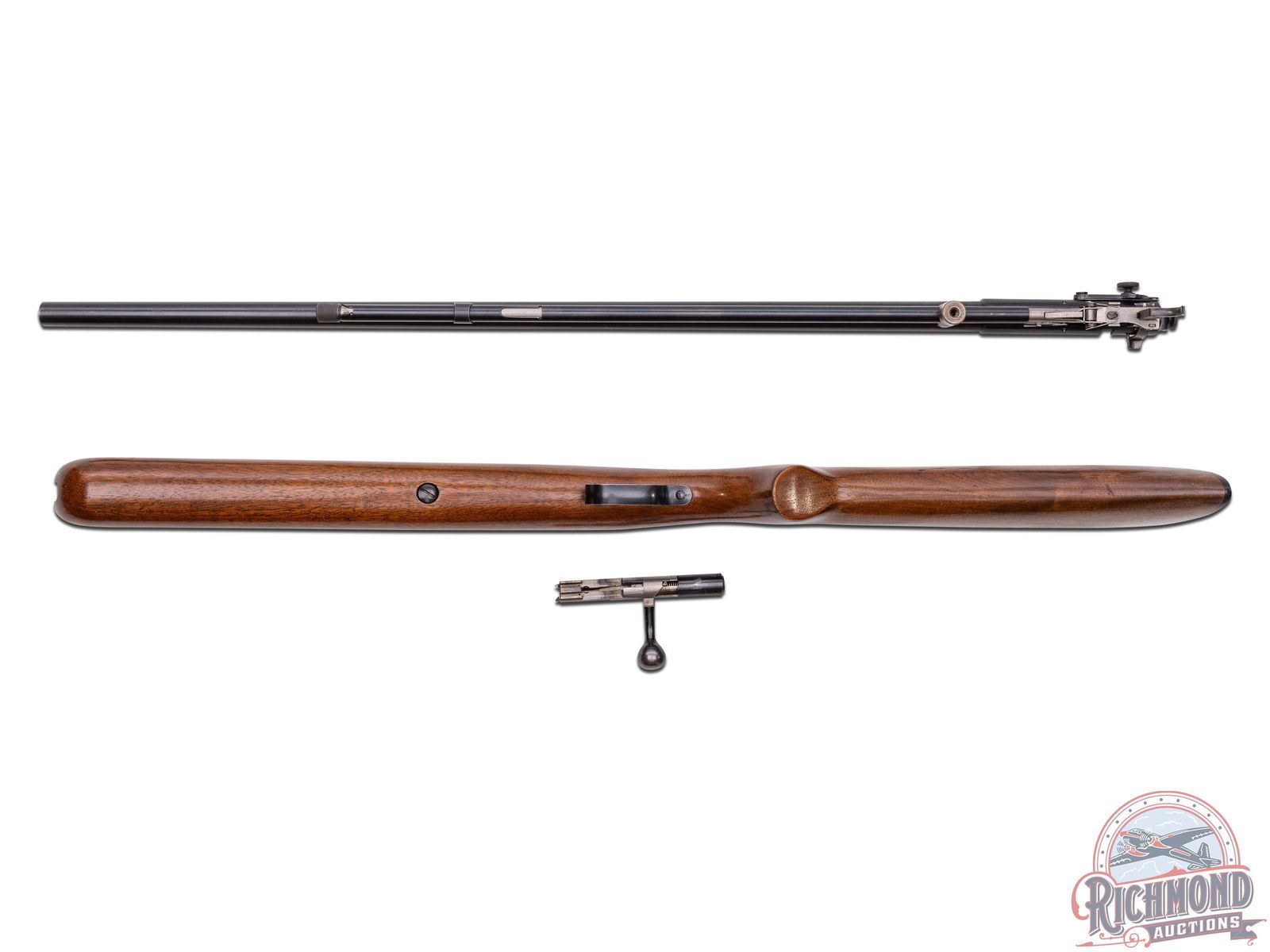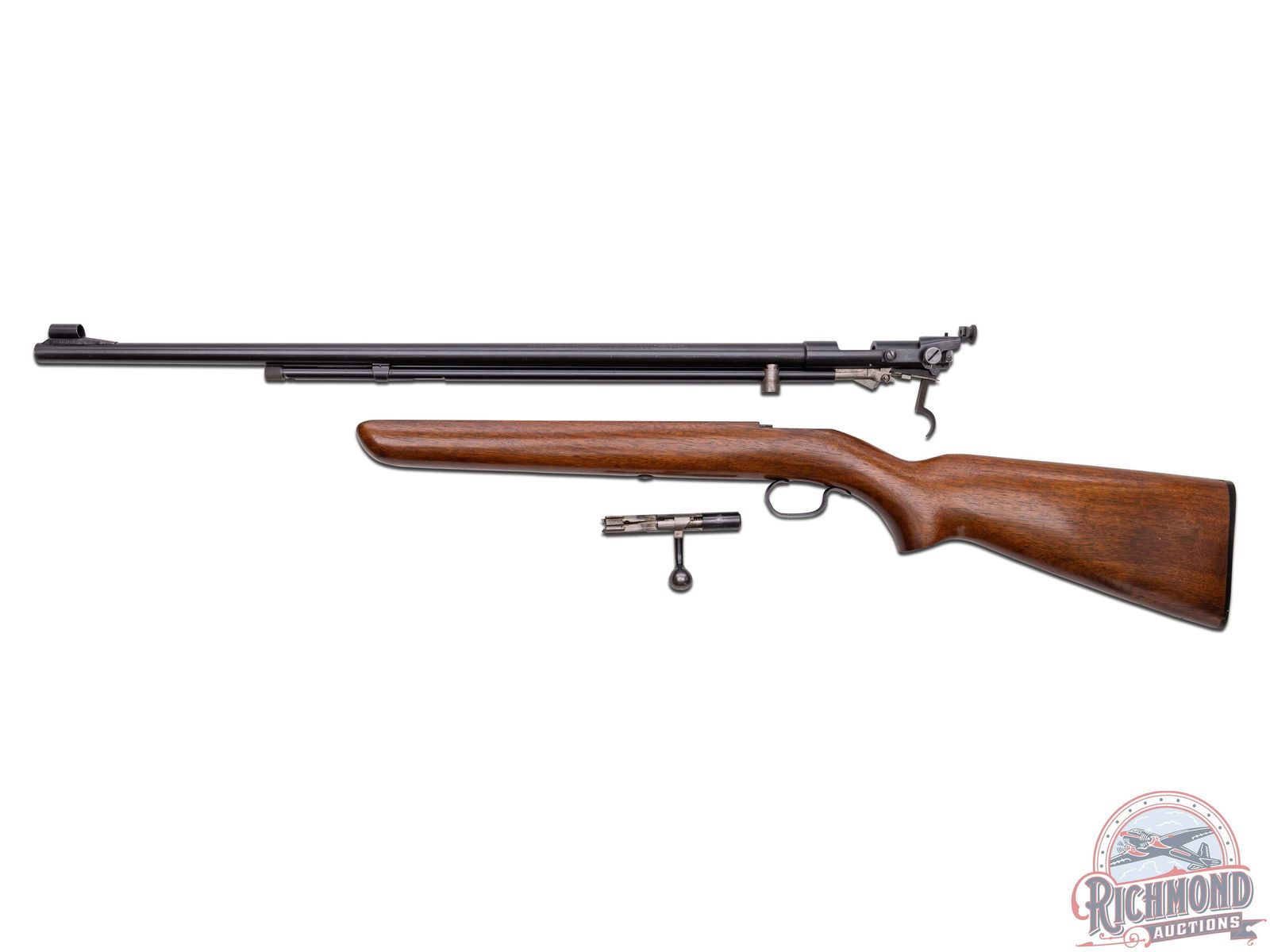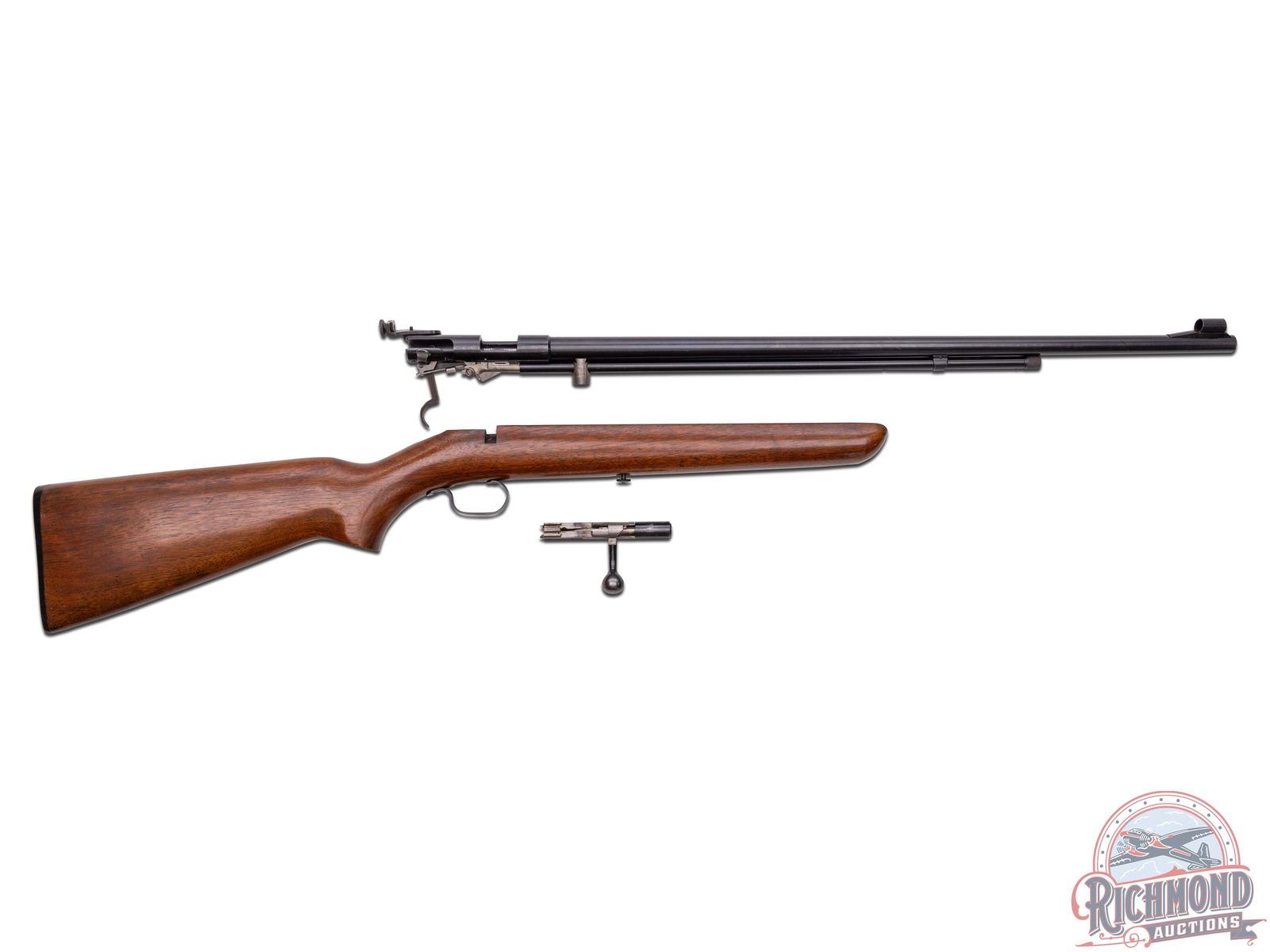 This Winchester was manufactured sometime between 1938 and 1940. This earlier version of the 72, is a catalog number 7201 with the Winchester 80A rear peep sight and cartridges - "SHORT / LONG / LONG RIFLE" spelled out on the barrel instead of being abbreviated. Features a 25" blued barrel with standard early version stampings and proof marks. Hooded front blade sight with the upgraded rear 80A peep sight. Winchester's first tube fed bolt action rifle holds up to 20 rounds of short, 16 rounds long and 15 rounds of long rifle. American black walnut sporter style stock with pistol grip and single screw take-down in the bottom of the forearm. Fitted with a Winchester logo black checkered synthetic butt plate. Comes in the original factory box with factory paperwork. LOP: 13-1/2". CALIBER: 22 S/L/LR. S/N: n/a. FFL STATUS: Curio & Relic.