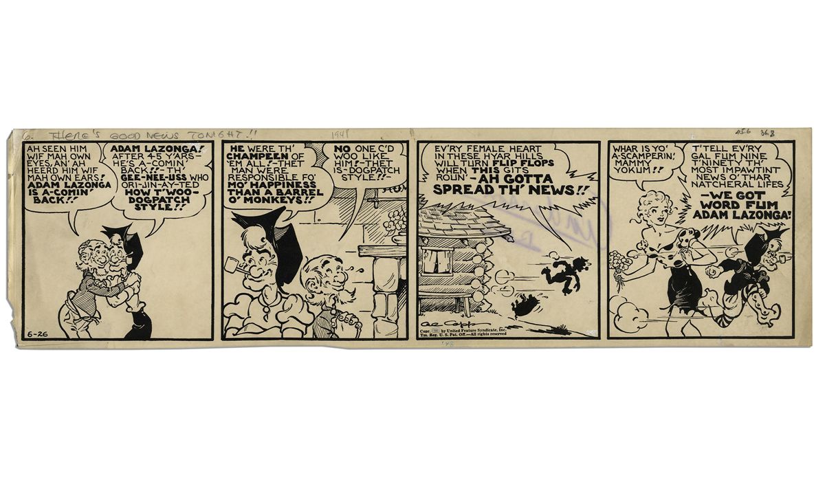 Nice Print of ''Li'l Abner'' 4-Panel Comic Strip From 26 June 1948 Featuring Daisy Mae, Mammy & Pappy & Salomey -- Some Capp Original Writing & White Out --  22.5'' x 7'' -- Toning, Near Fine