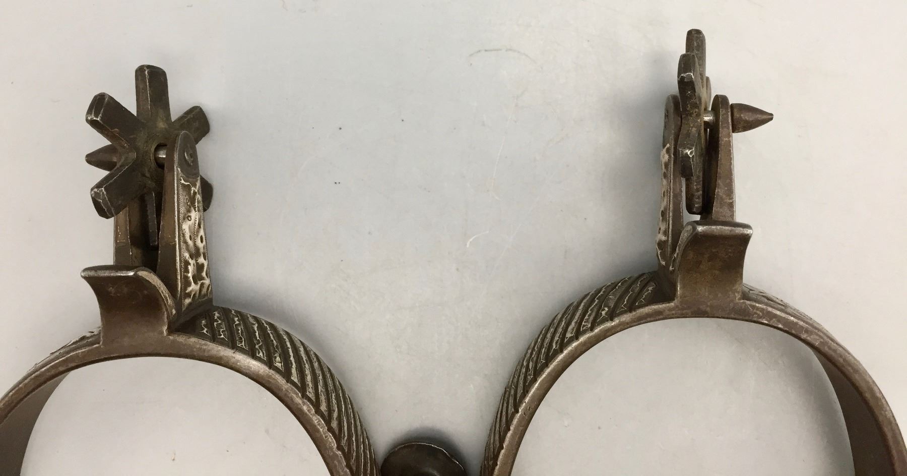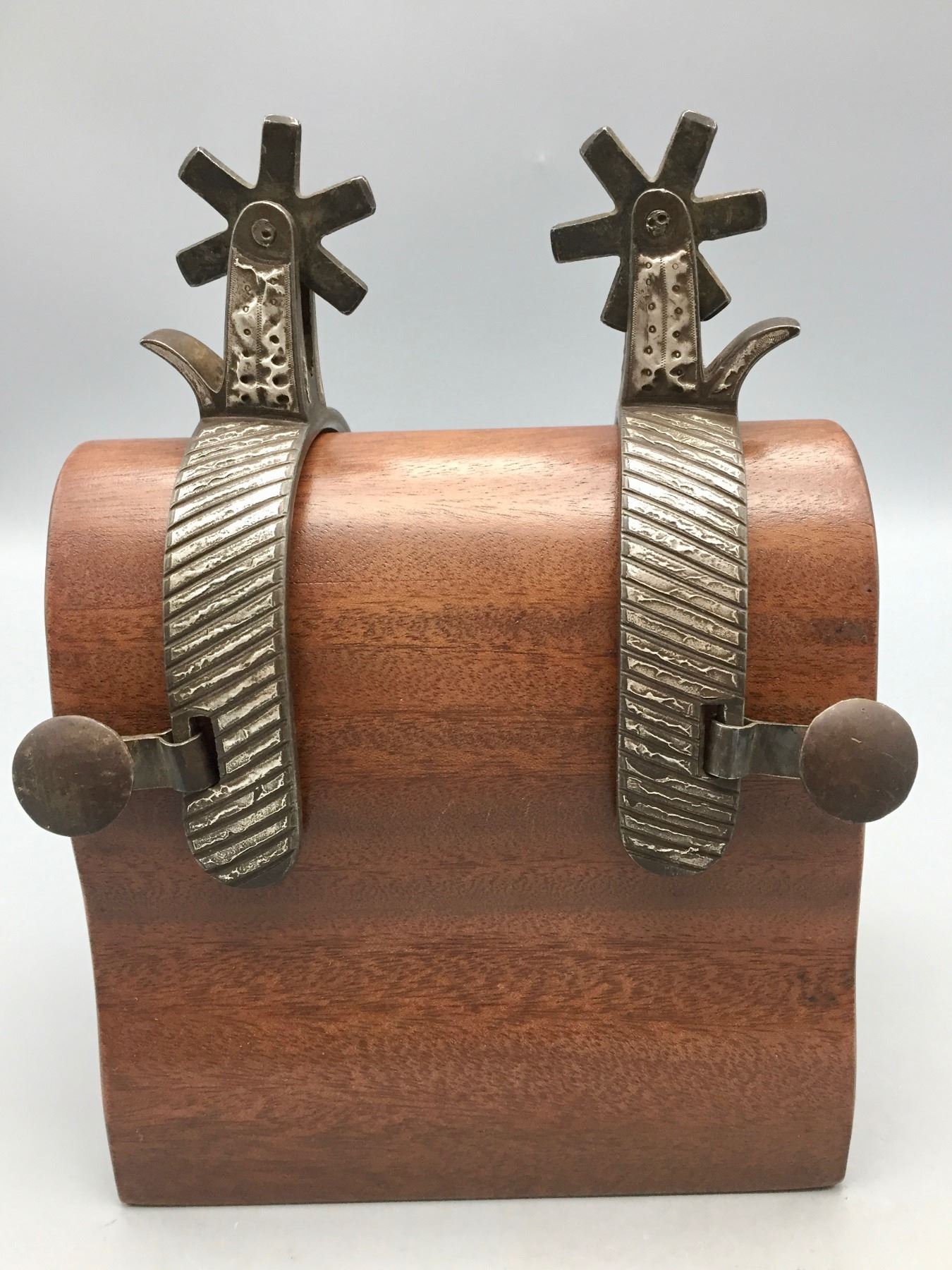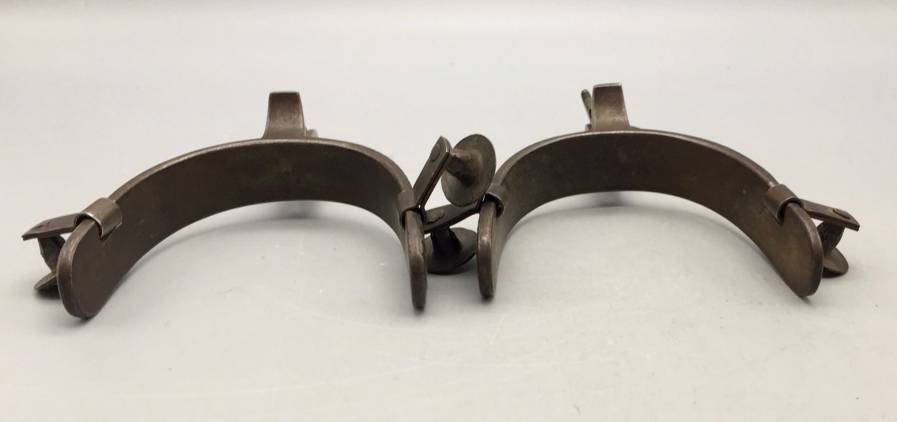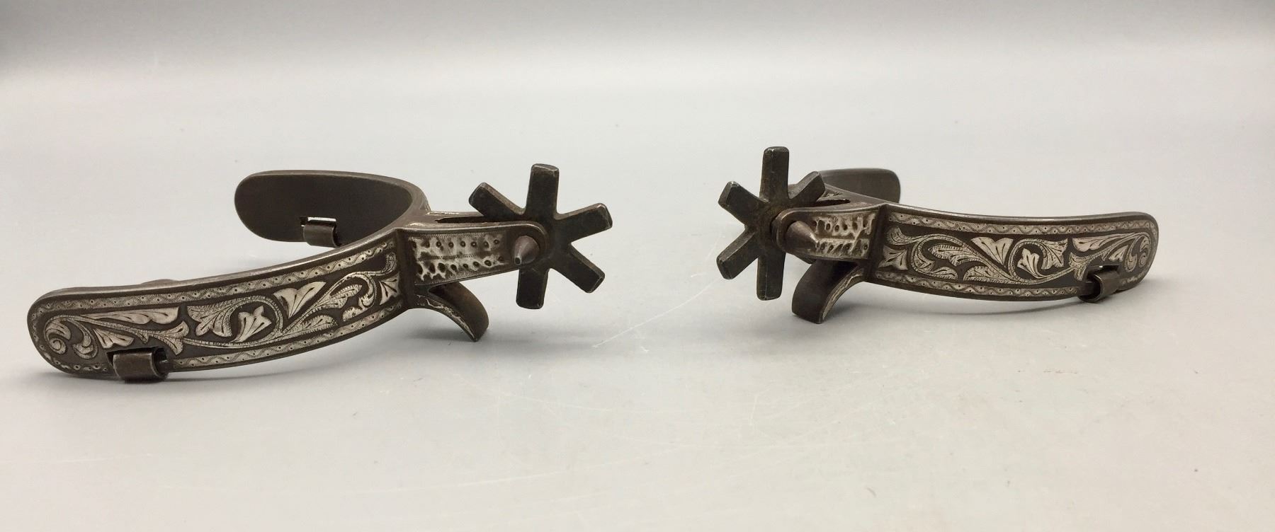 Description: Presented for sale in this lot is a nice pair of silver overlay spurs with engraved decorations, chap guards and silver mounted swing buttons on one side. This would be a good pair of using spurs, or great to hang on the wall and collect. Maker: Unmarked. Approx. Age: Vintage. Size: Heel 3” opening, shank 3” long overall. Condition: Good for their age, normal wear expected. Please look closely at the pictures - they are an important part of our description. Shipping: There will be a $5 handling / packaging fee for shipping this lot. The actual cost of postage will be added on top of that.