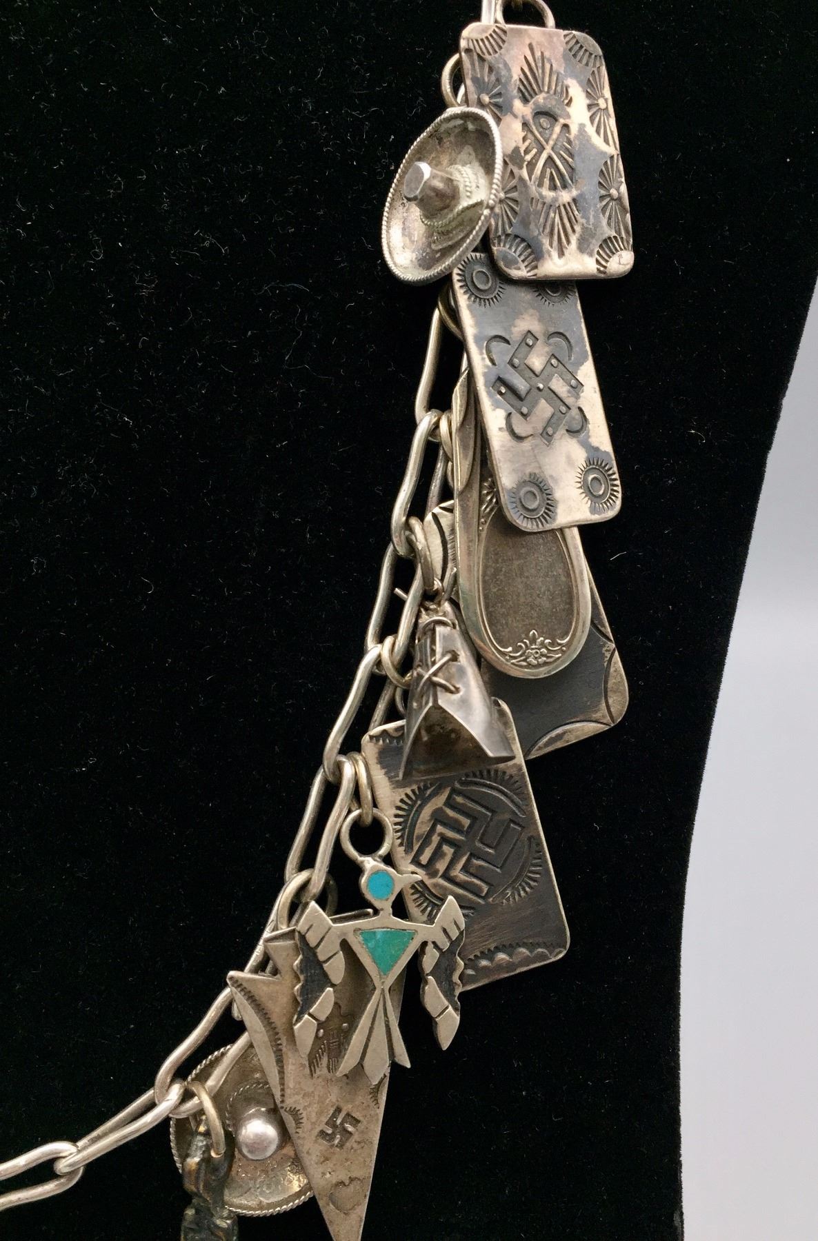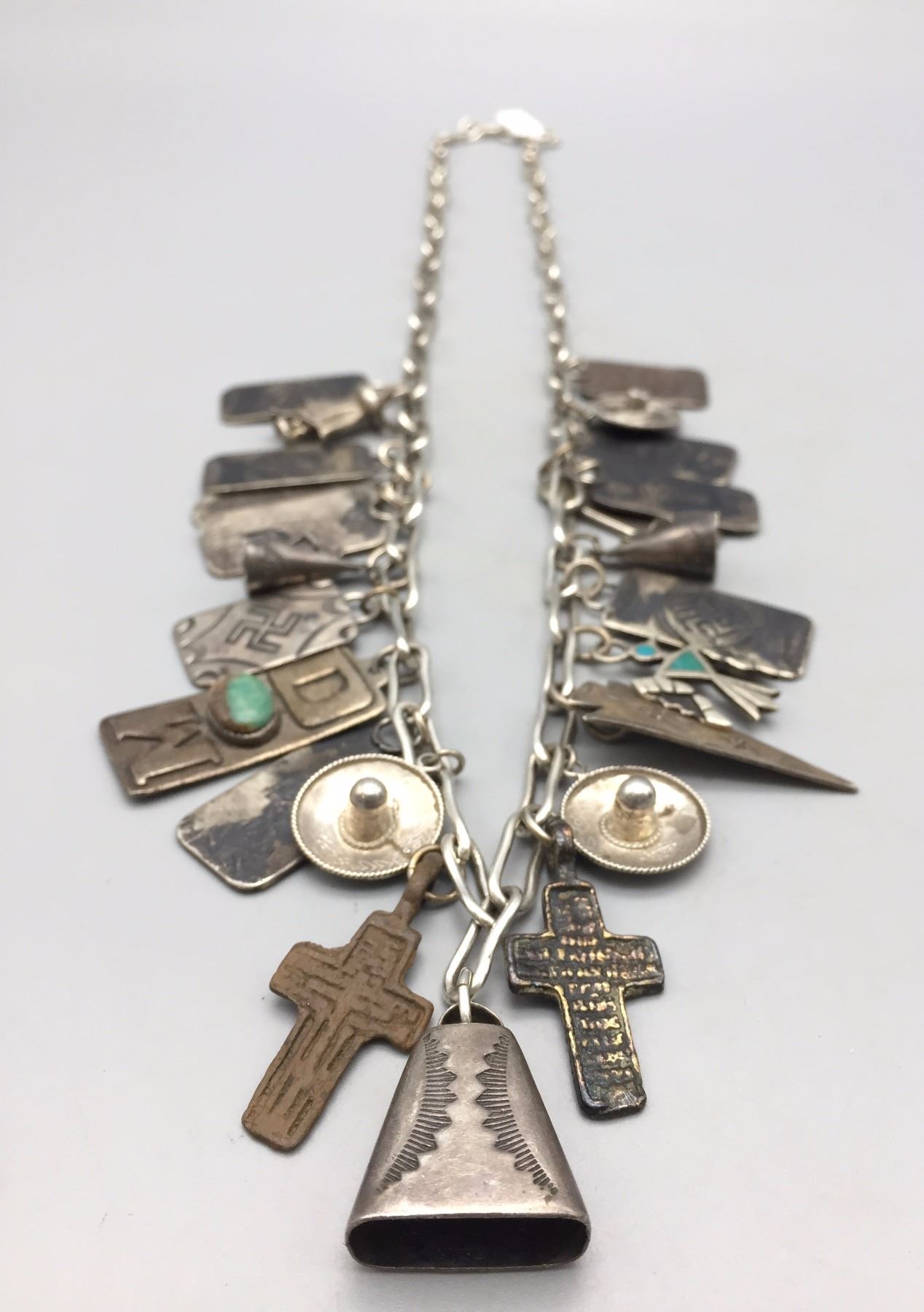 Description: Unique charm necklace with various, hand-stamped, sterling silver charms, some with turquoise accents (one of the old crosses is copper). Maker: Various. Approx. Age: Ages range from very old (the crosses) to fairly modern (and several in between). Size: Measures 30” around the neck and weighs 142.6 g. Condition: Good for its age, normal wear expected. Please look closely at the pictures - they are an important part of our description. Shipping: There will be a $5 handling / packaging fee for shipping this lot. The actual cost of postage will be added on top of that.