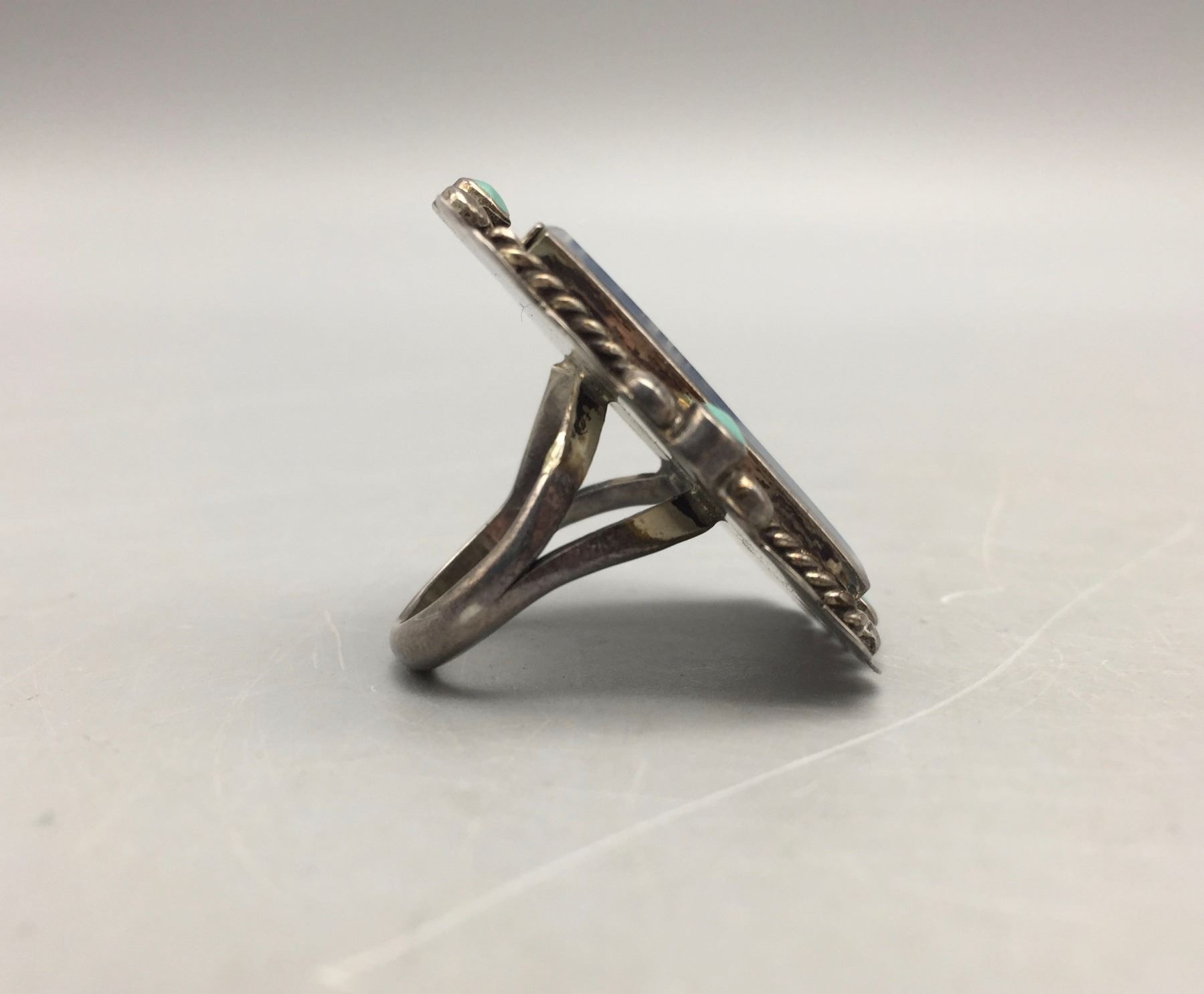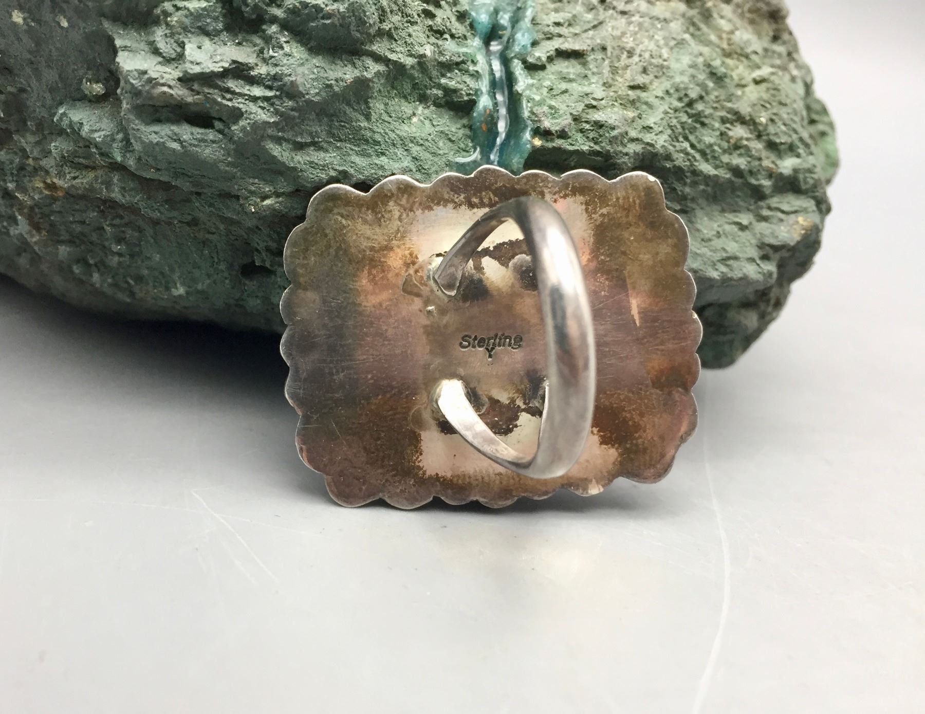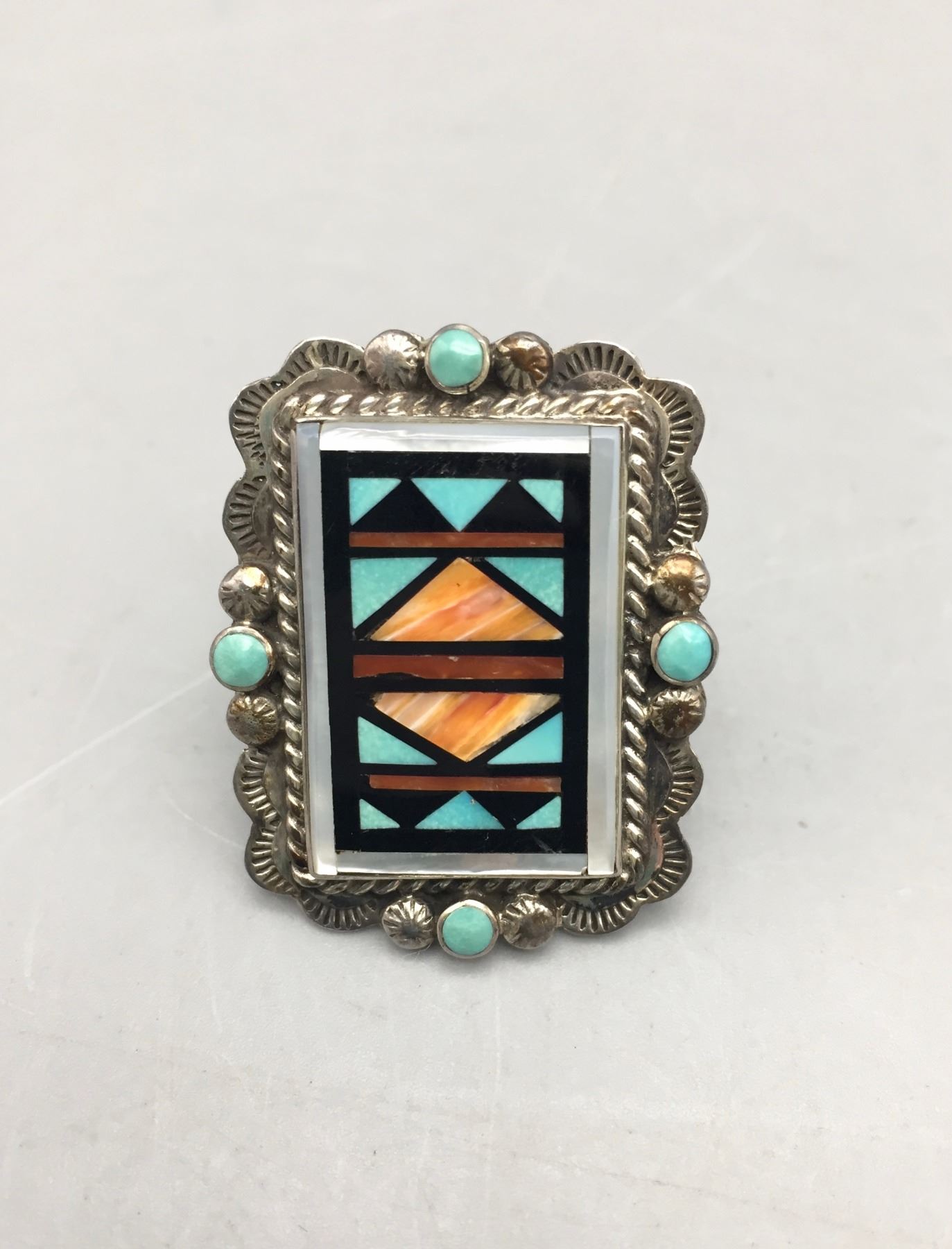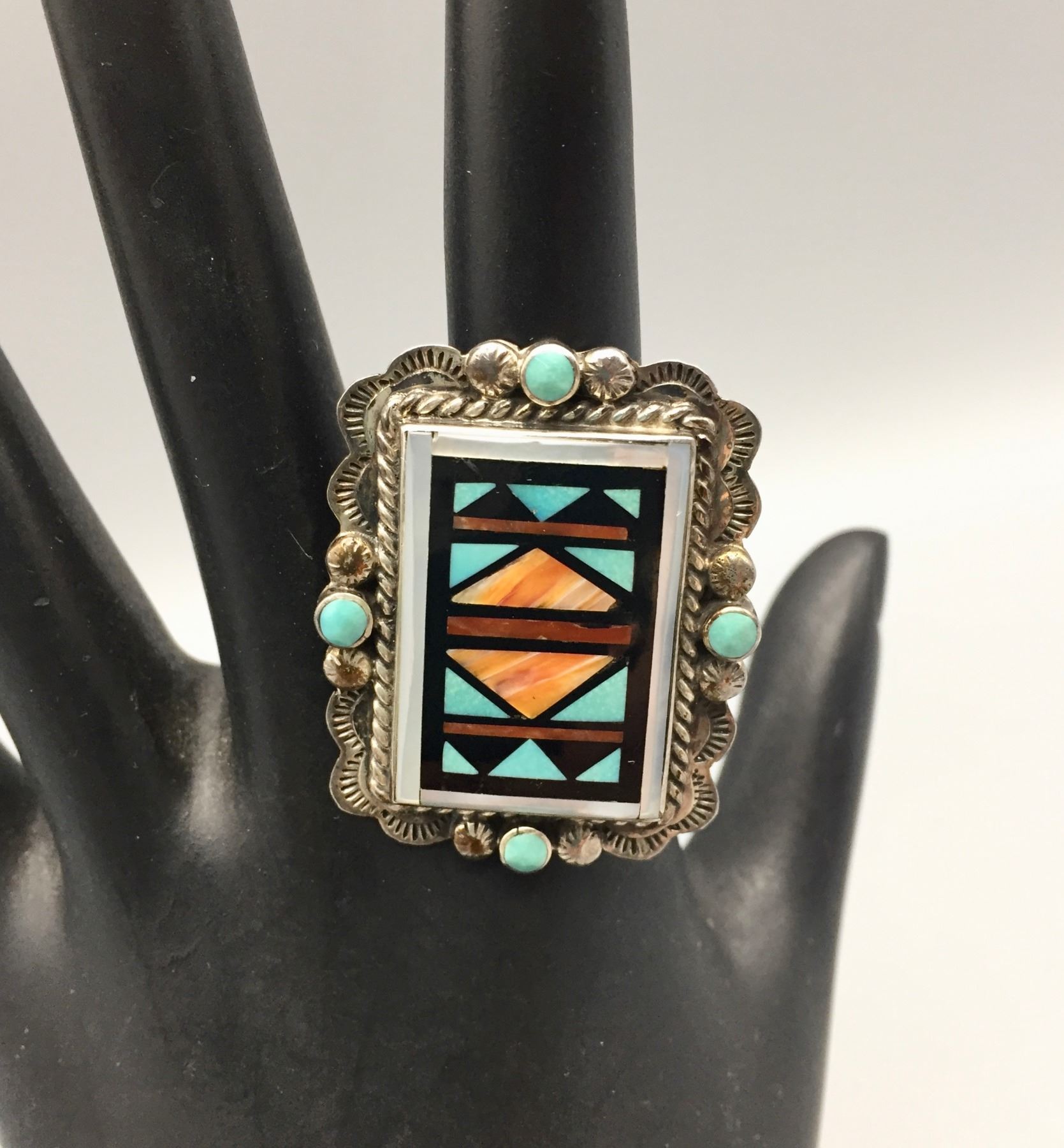 Description: Presented in this lot is a nice inlay ring, featuring turquoise, spiny oyster, black onyx, coral, and mother of pearl, surrounded by intricate silver work. Marked as sterling silver. Maker: Unknown Artist but from Gilbert Ortega’s Shop, Scottsdale, AZ. Approx. Age: Vintage. Size: Size 8. Measures 1-1/8” w x 1-1/2” long. Weighs 13.7 grams. Condition: Good for its age, normal wear expected. Please look closely at the pictures - they are an important part of our description. Shipping: There will be a $5 handling / packaging fee for shipping this lot. The actual cost of postage will be added on top of that.
