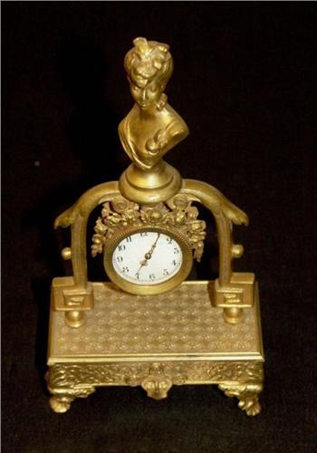 Jolie montre de table en laiton doré portique buste de femme, vers 1920