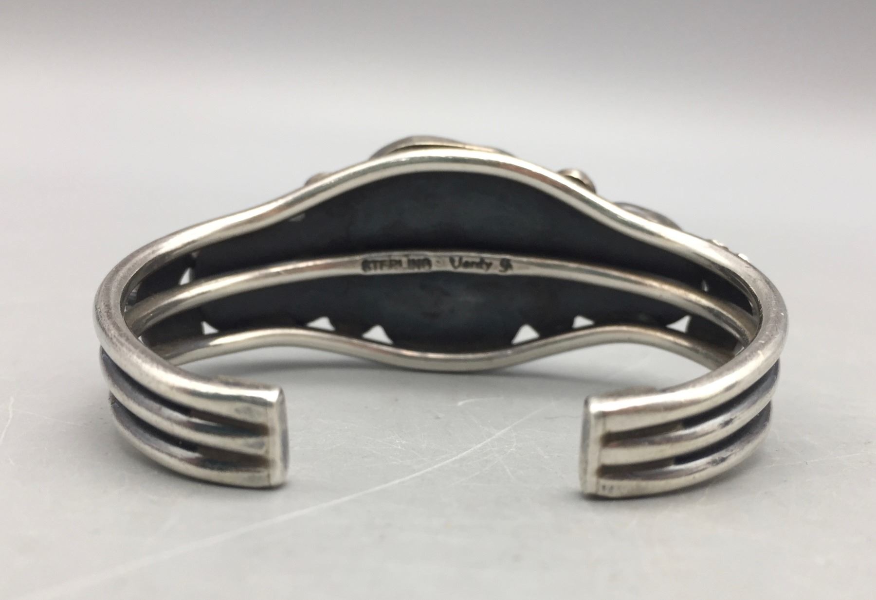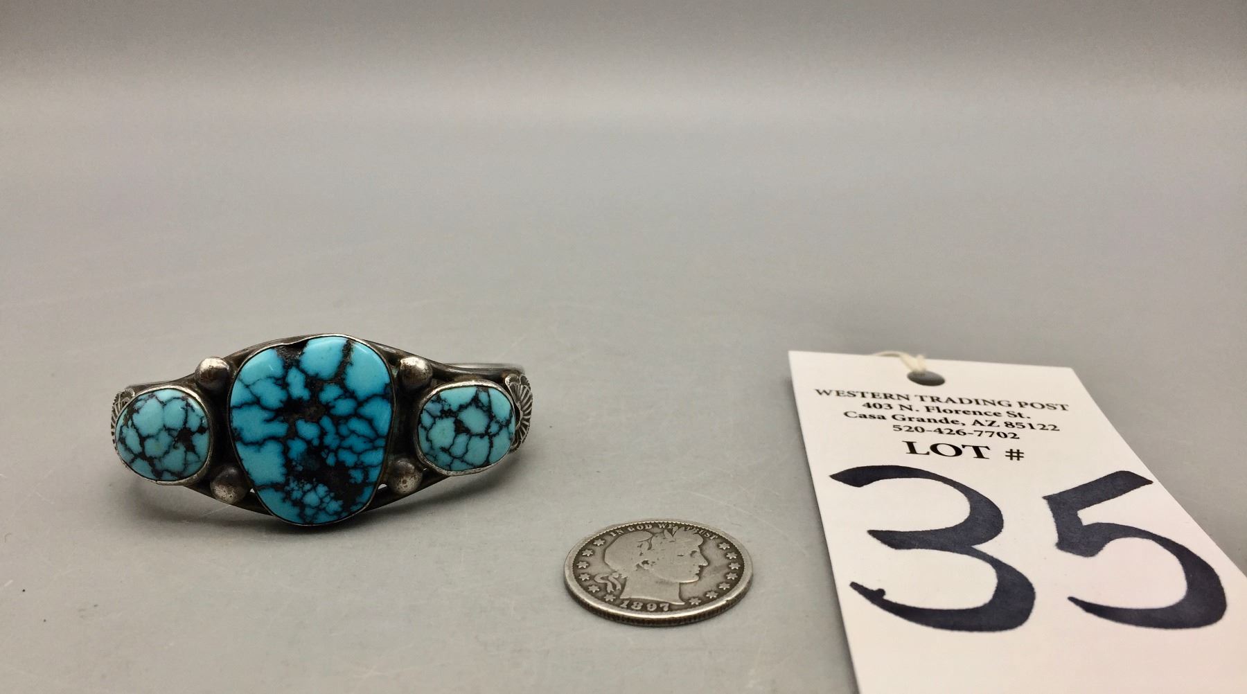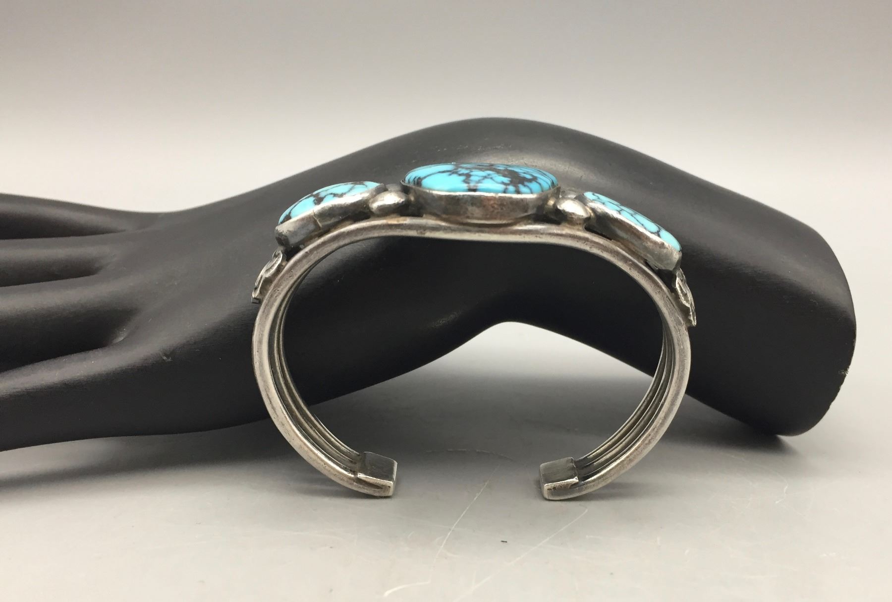 Description: Included in this lot is a nice sterling silver bracelet featuring three great turquoise cabochons that all have a nice black/brown matrix. Stamped as sterling silver. Maker: Hallmarked Verdy J. for Verdy Jake, Navajo. Approx. Age: Fairly modern. Size: 1”w x 5-1/8” long, opening 7/8” fits a 7” wrist. Weighs 40.3 grams. Condition: Good for its age, normal wear expected. Please look closely at the pictures - they are an important part of our description. Shipping: There will be a $5 handling / packaging fee for shipping this lot. The actual cost of postage will be added on top of that.