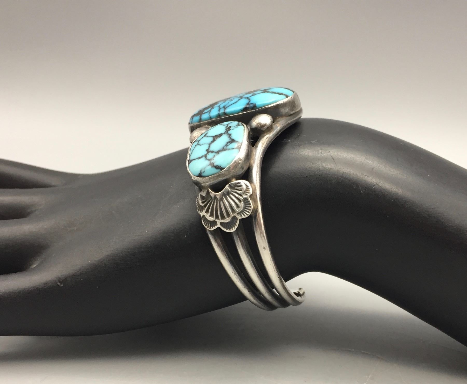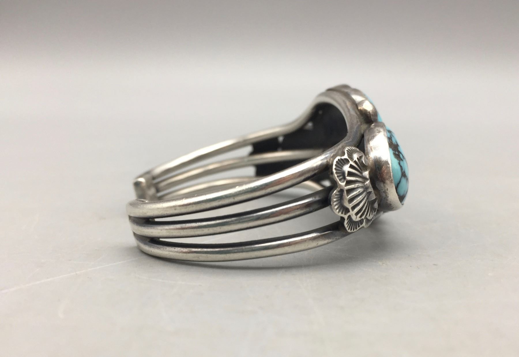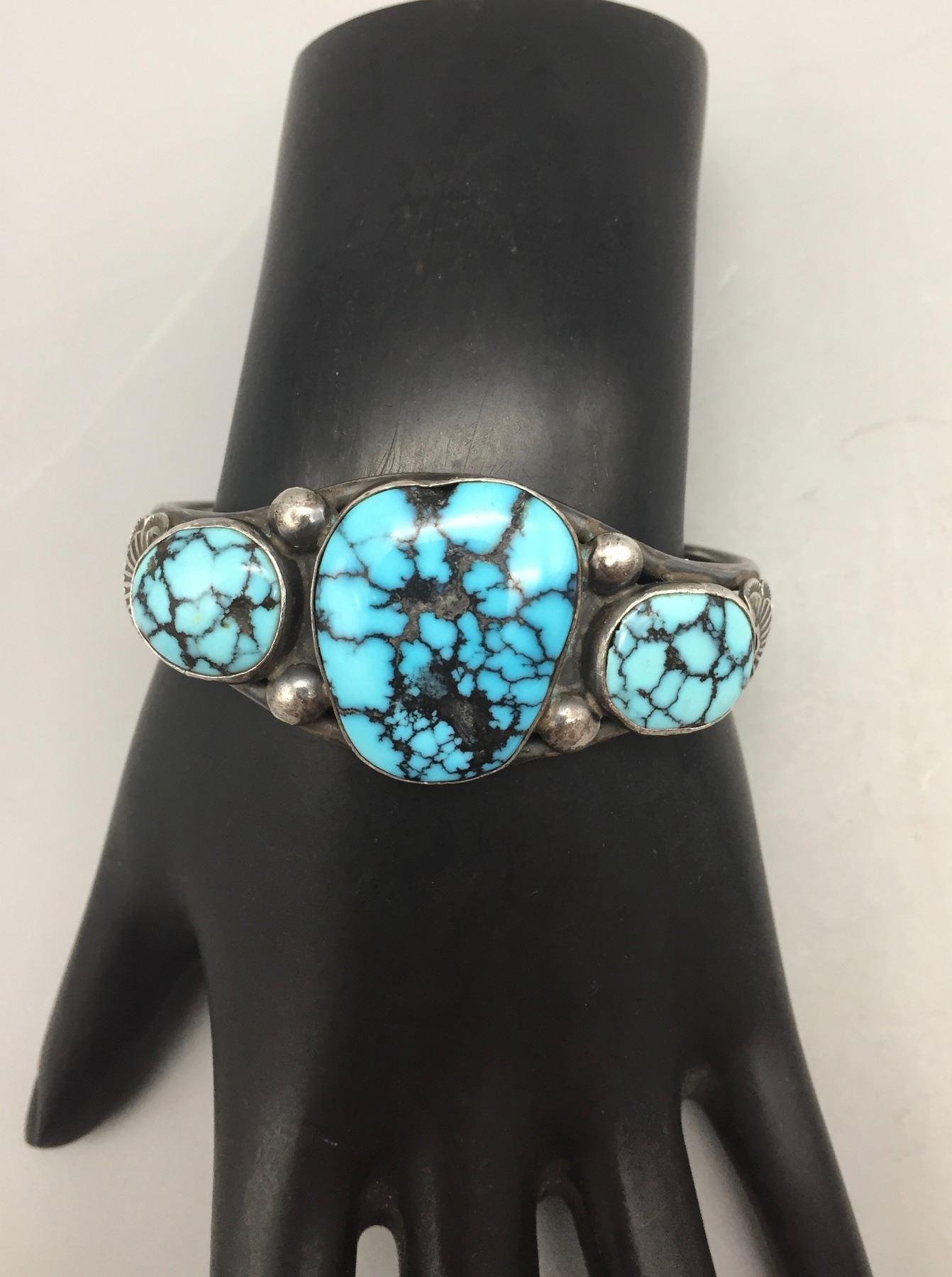 Description: Included in this lot is a nice sterling silver bracelet featuring three great turquoise cabochons that all have a nice black/brown matrix. Stamped as sterling silver. Maker: Hallmarked Verdy J. for Verdy Jake, Navajo. Approx. Age: Fairly modern. Size: 1”w x 5-1/8” long, opening 7/8” fits a 7” wrist. Weighs 40.3 grams. Condition: Good for its age, normal wear expected. Please look closely at the pictures - they are an important part of our description. Shipping: There will be a $5 handling / packaging fee for shipping this lot. The actual cost of postage will be added on top of that.