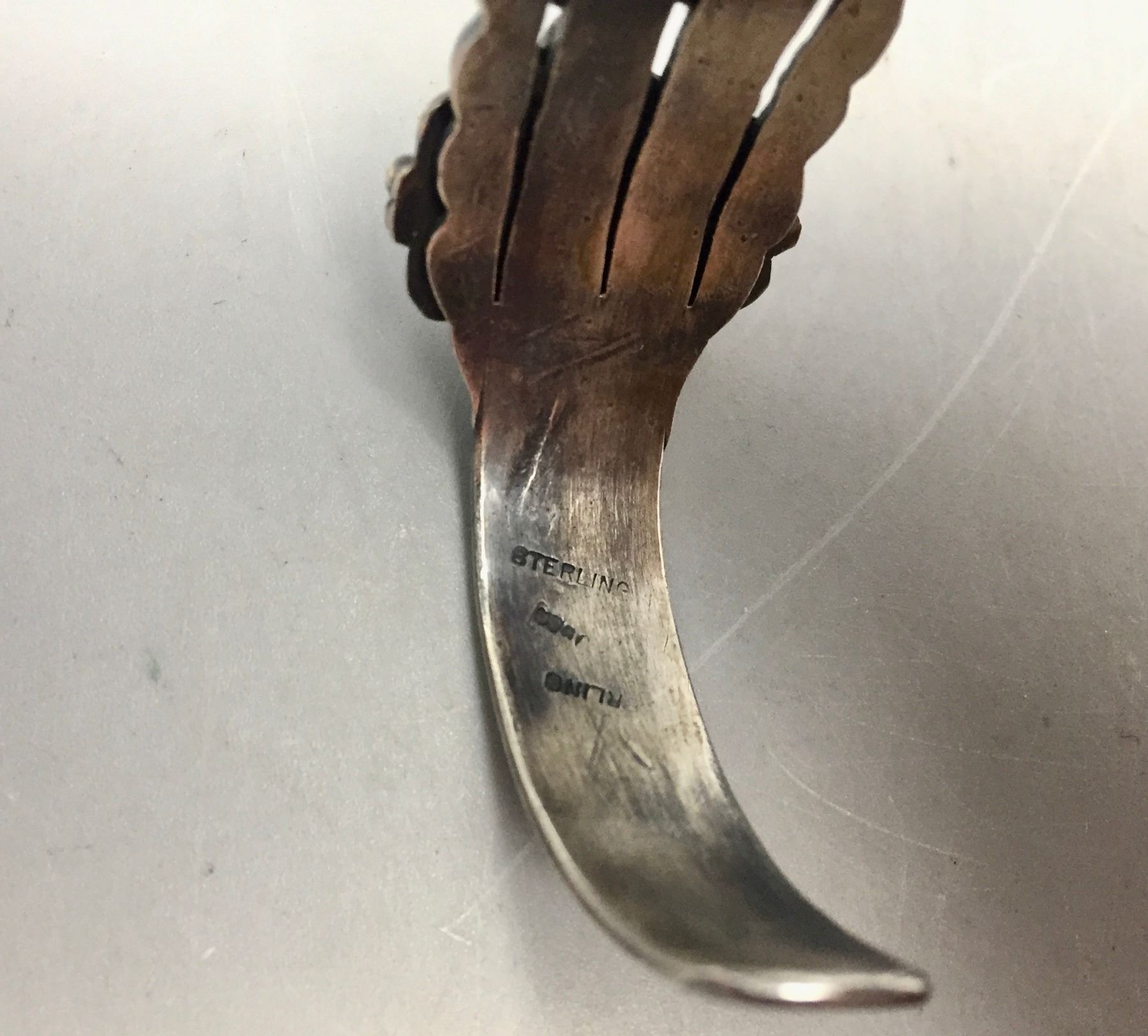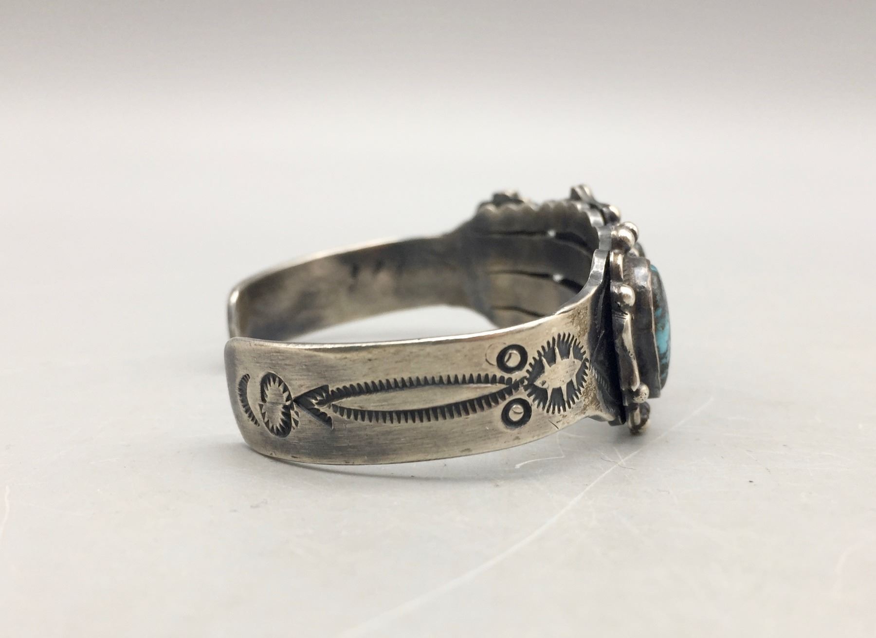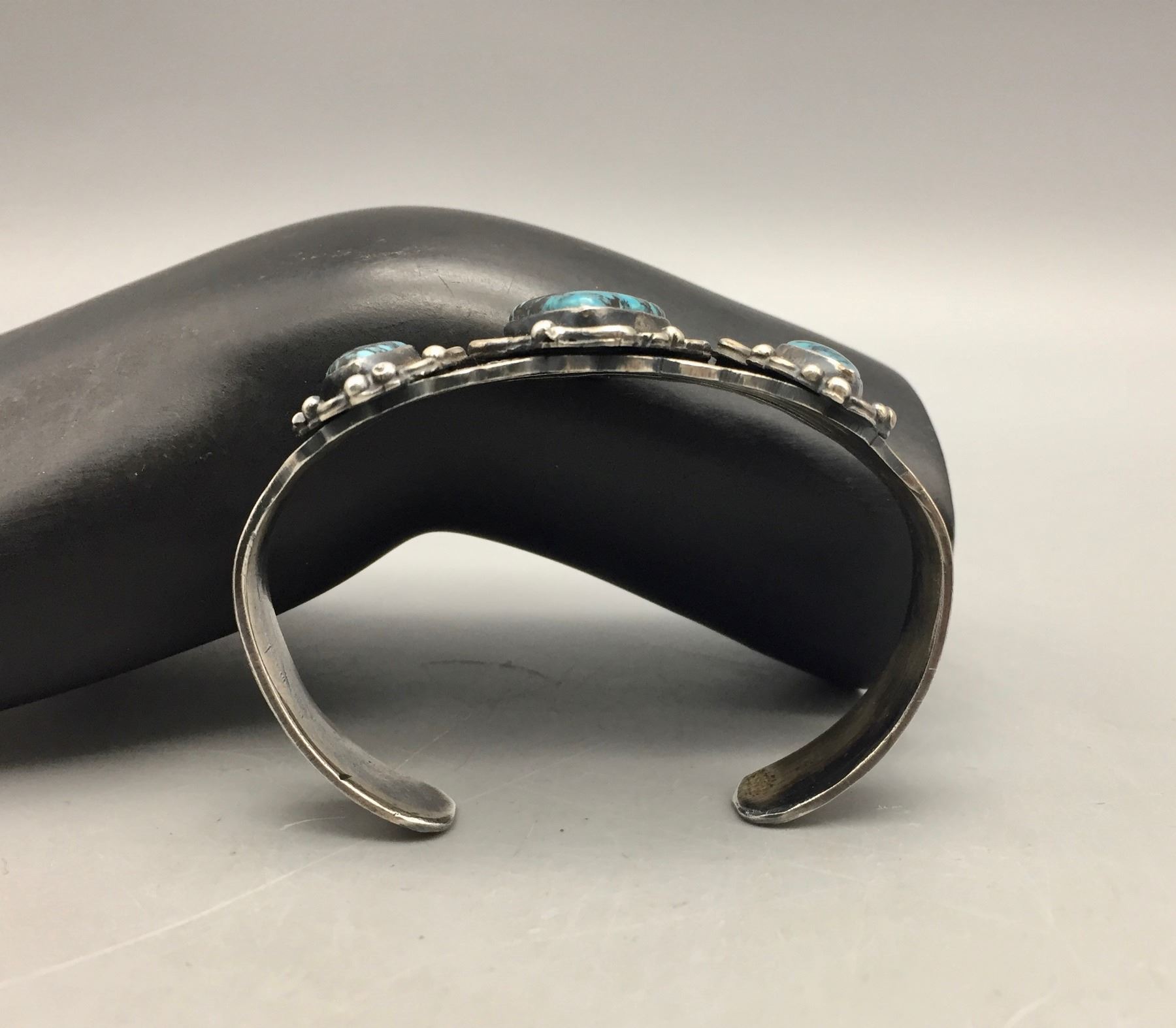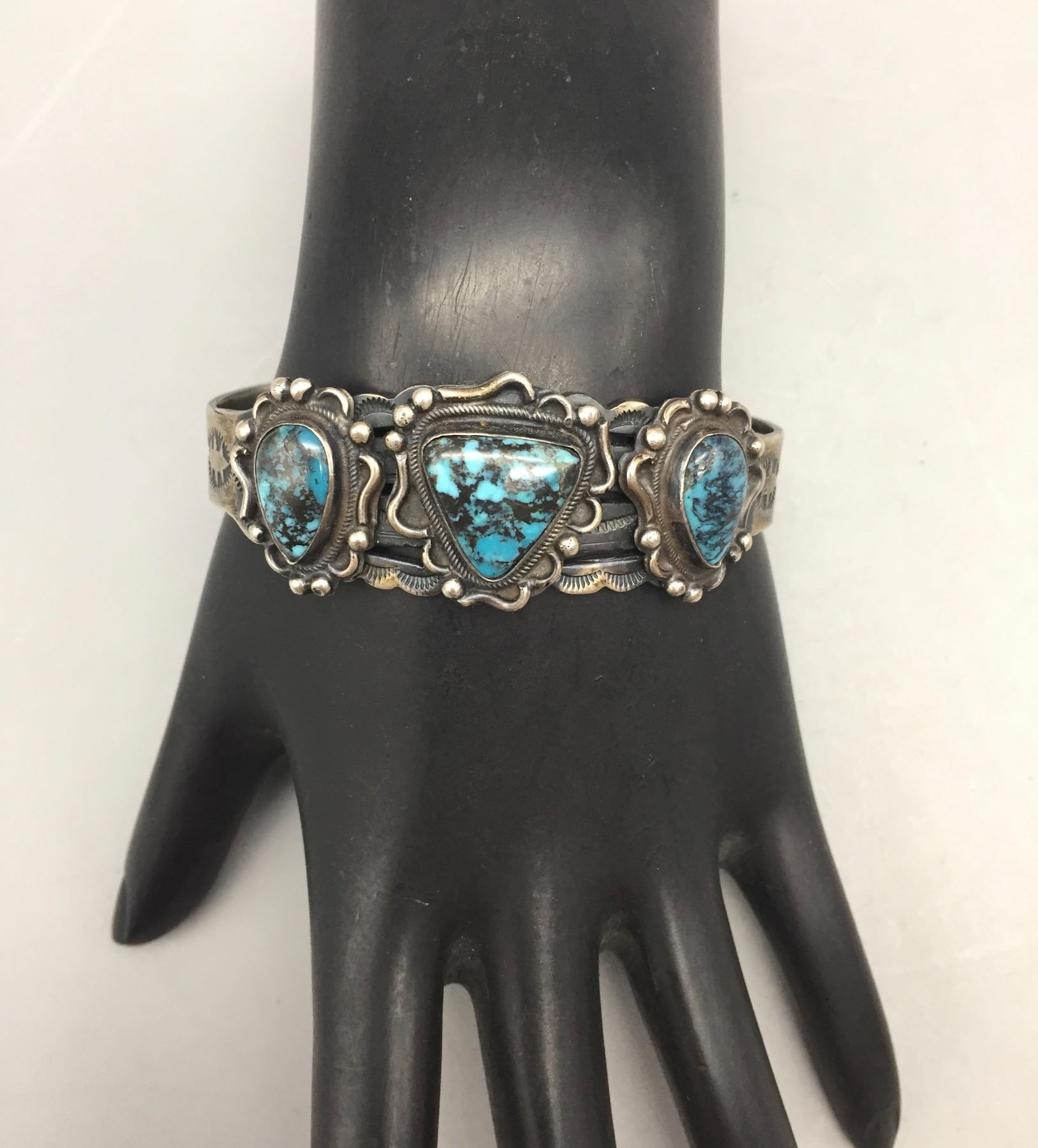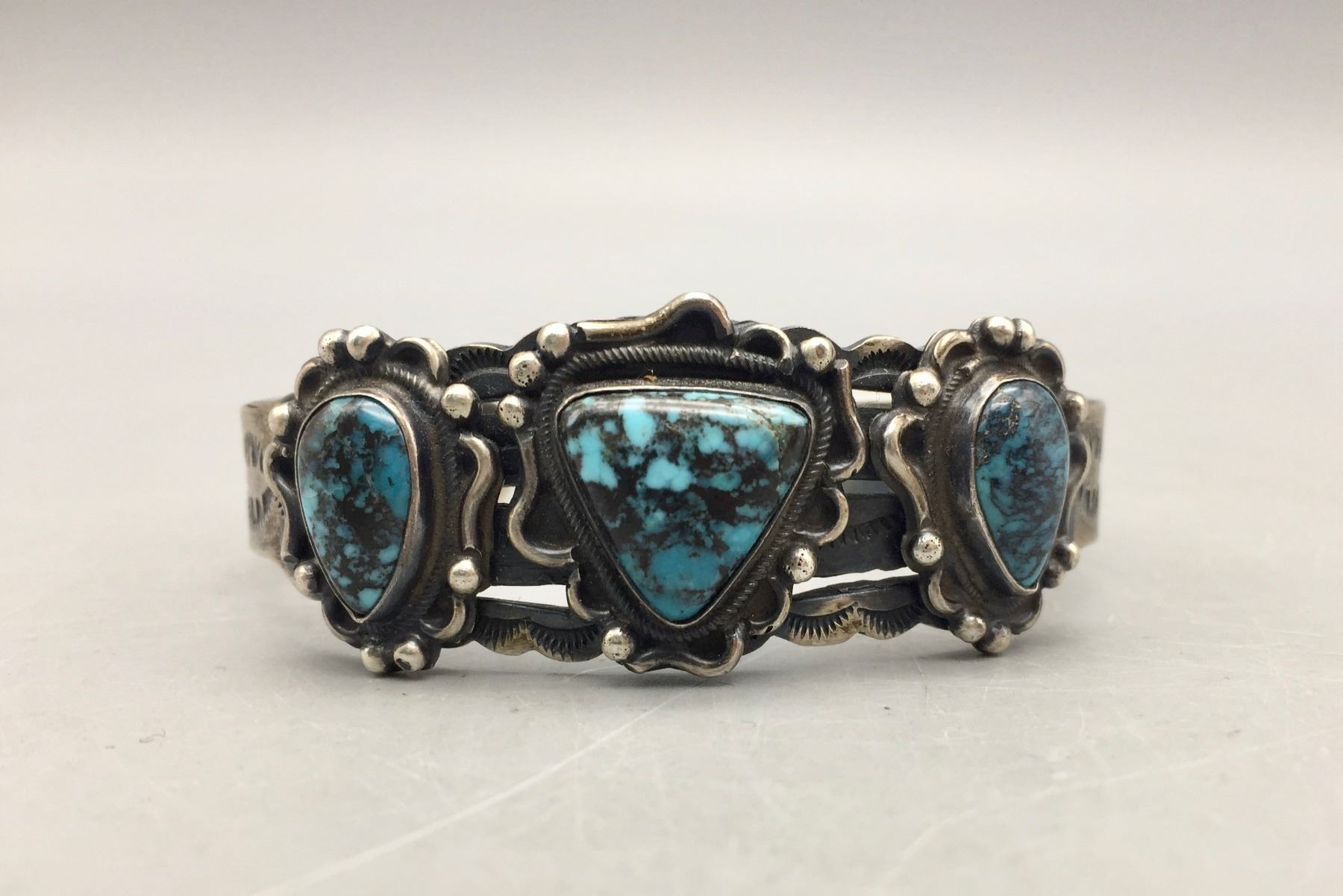 Description: For sale in this lot is a nice three stone turquoise bracelet. This bracelet features dark blue colored turquoise with a dark matrix. Nice stones! Stamped as sterling silver. Maker: Unknown. Approx. Age: Vintage. Size: 7/8”w x 5-3/8” long, opening 1” fits a 6-3/8” wrist. Weighs 34.6 grams. Condition: Good for its age, normal wear expected. Please look closely at the pictures - they are an important part of our description. Shipping: There will be a $5 handling / packaging fee for shipping this lot. The actual cost of postage will be added on top of that.