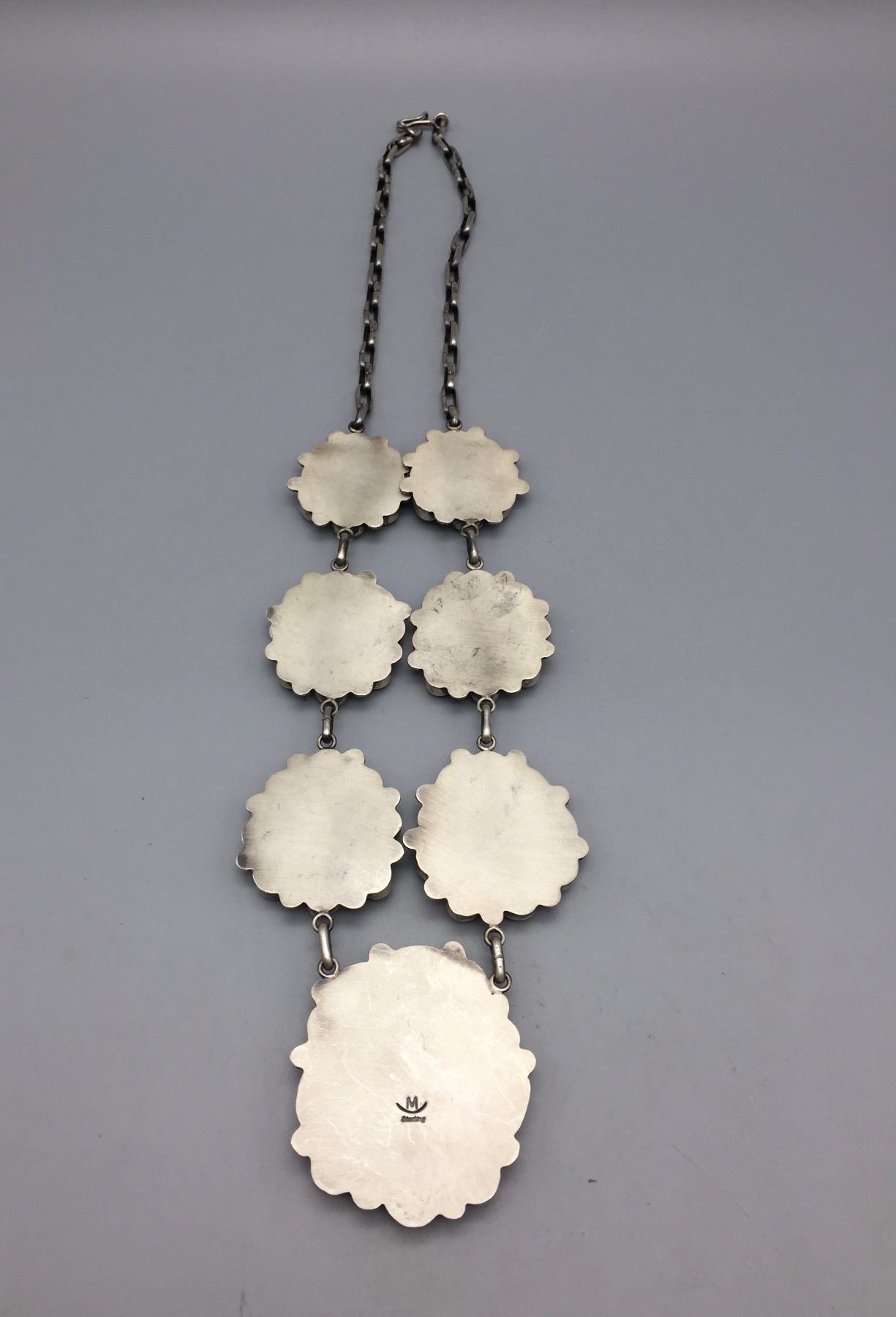 Maker: Morris Begay, Navajo. Approx. Age: Fairly modern. Size: Fits 27” around the neck with center cluster measuring 2 1/4” w x 2 1/2” l. Weighs 246.9 g. Additional Info: Beautiful turquoise cluster necklace with what appears to be Dry Creek Turquoise! This necklace is featured on an episode of Western Trading Post TV! Condition: Good for it’s age, normal wear expected. Please look closely at the pictures - they are an important part of our description. Shipping: There will be a $5 handling / packaging fee for shipping this lot. The actual cost of postage will be added on top of that.