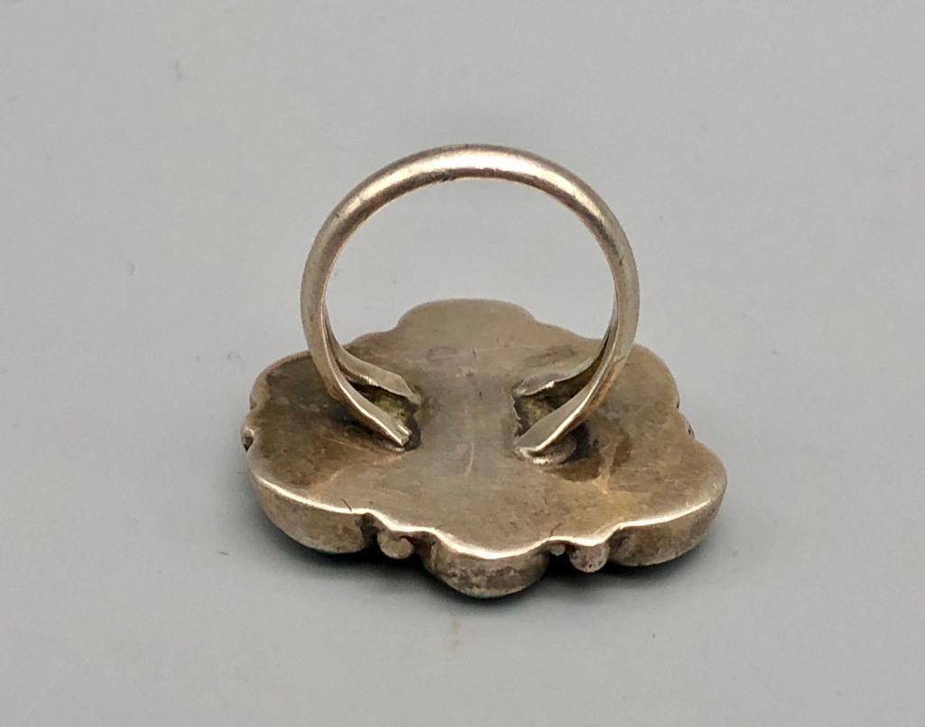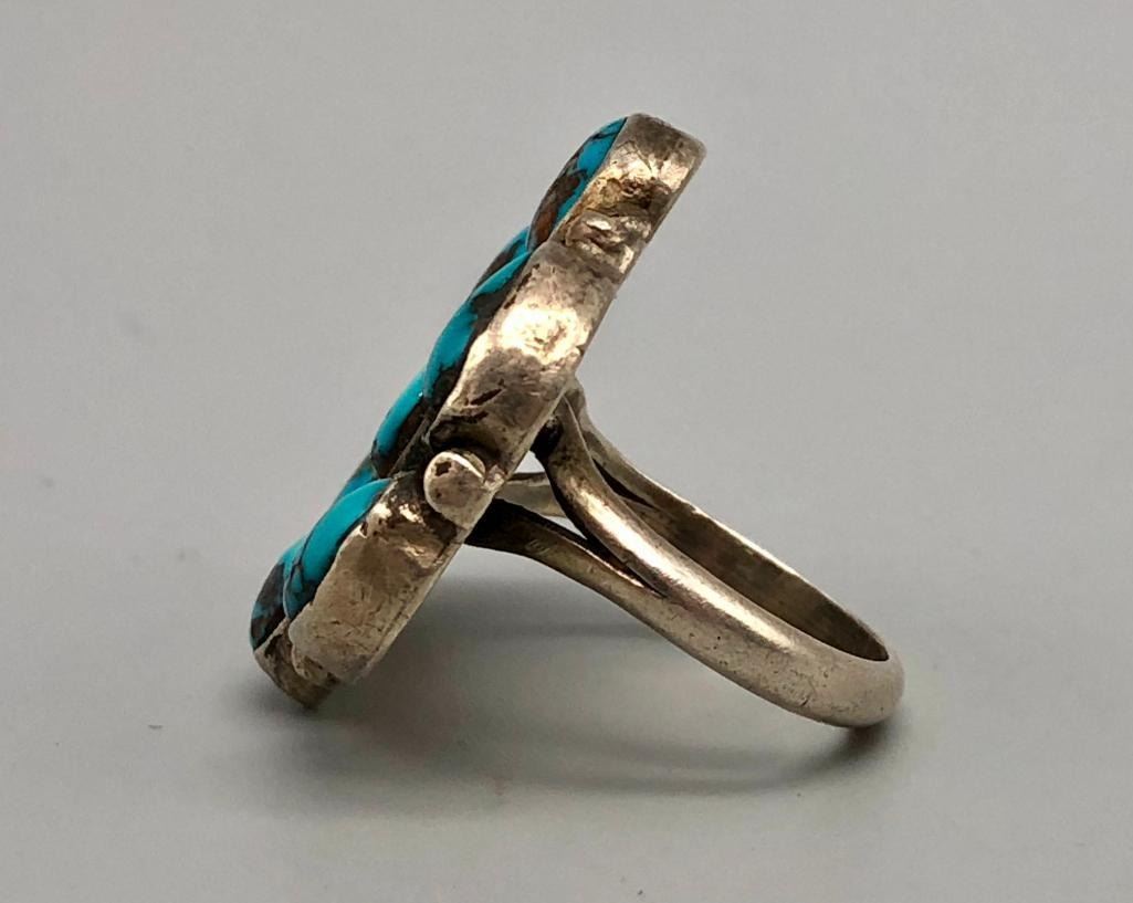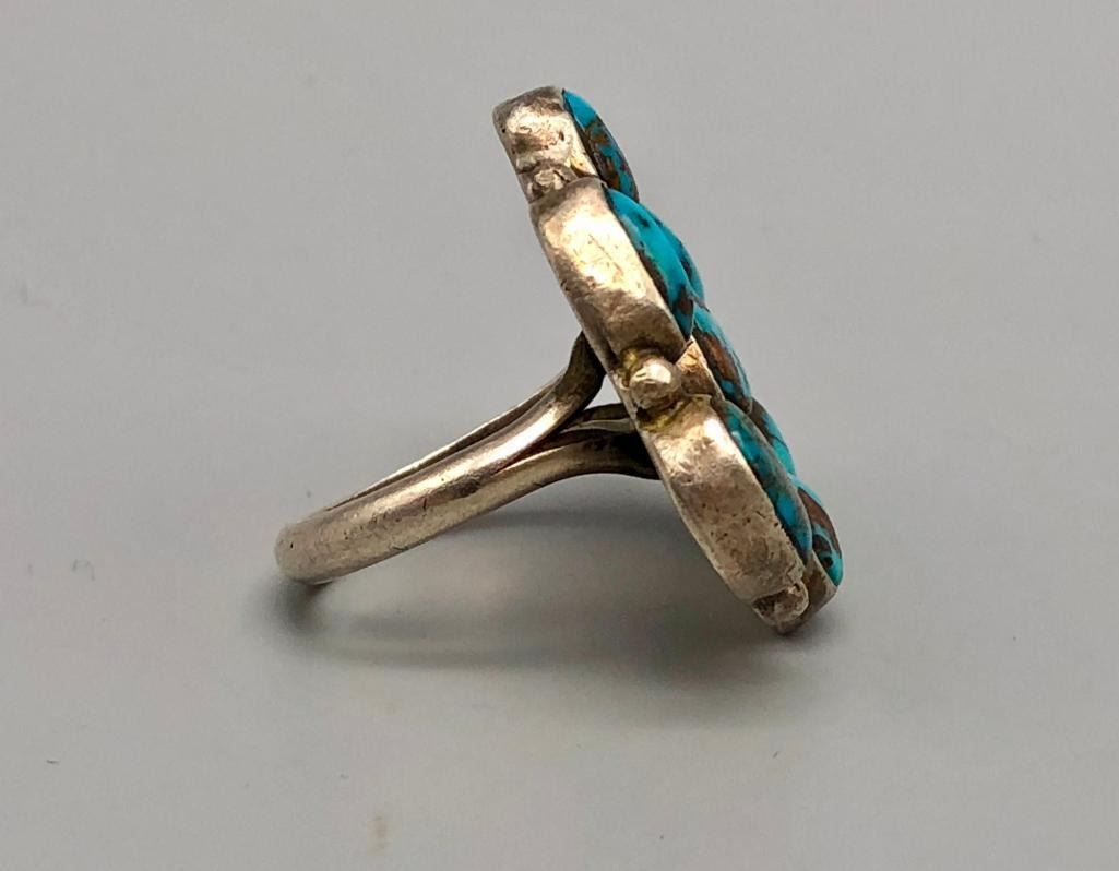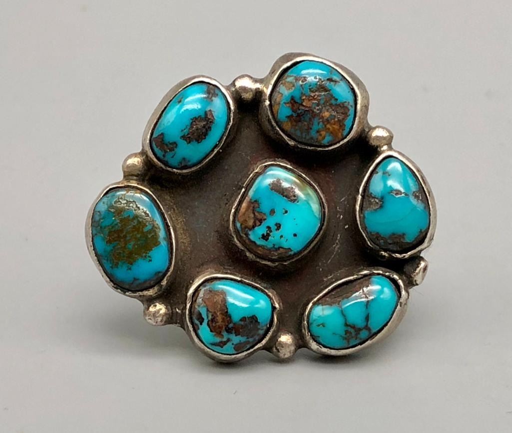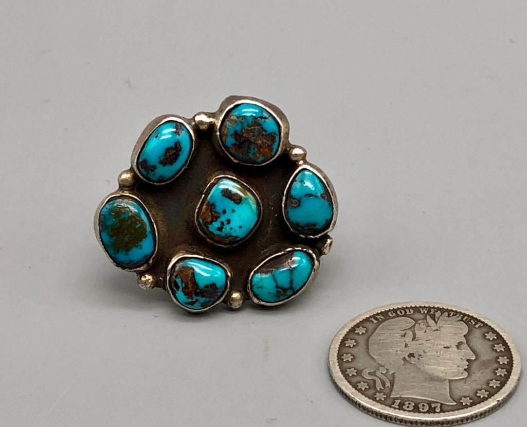 Offered for sale in this lot is a nice turquoise cluster ring. It is set with seven lovely turquoise cabochons that have good matrix throughout and are starting to darken due to age. It is made from sterling silver. MAKER: Unmarked. APPROX AGE: Circa 1960s. SIZE: Fits a size 8. 1-1/8 inches long X 1-1/4 inches wide. Weighs 13.1 grams. CONDITION: Good for its age, normal wear expected. Please look closely at the pictures as they are an important part of our description and are hereby incorporated into the description, specifically with regards to condition. SHIPPING: There will be a $5 handling / packaging fee for shipping this lot. The actual cost of postage will be added on top of that. BUY IT NOW: If you would like to buy this item now, without waiting for the auction day to bid on it, we do offer this option (which is available up to 48 hours before the actual auction starts). The “Buy it Now†price is the high estimate of this lot (plus applicable fees and the Buyer's premium is discounted to 10% when using the Buy it Now option). If you would like to exercise this option, you must contact us by email (or phone as long as you talk to someone live). Reference this lot number and your intention to "Buy it Now."