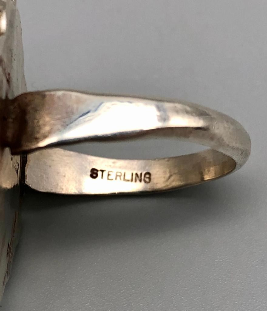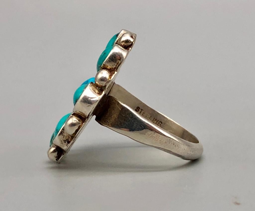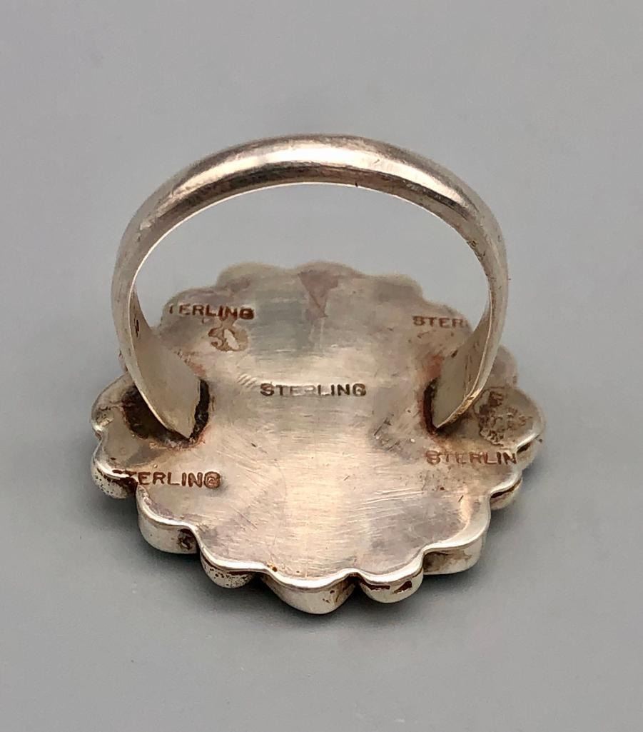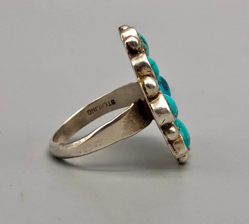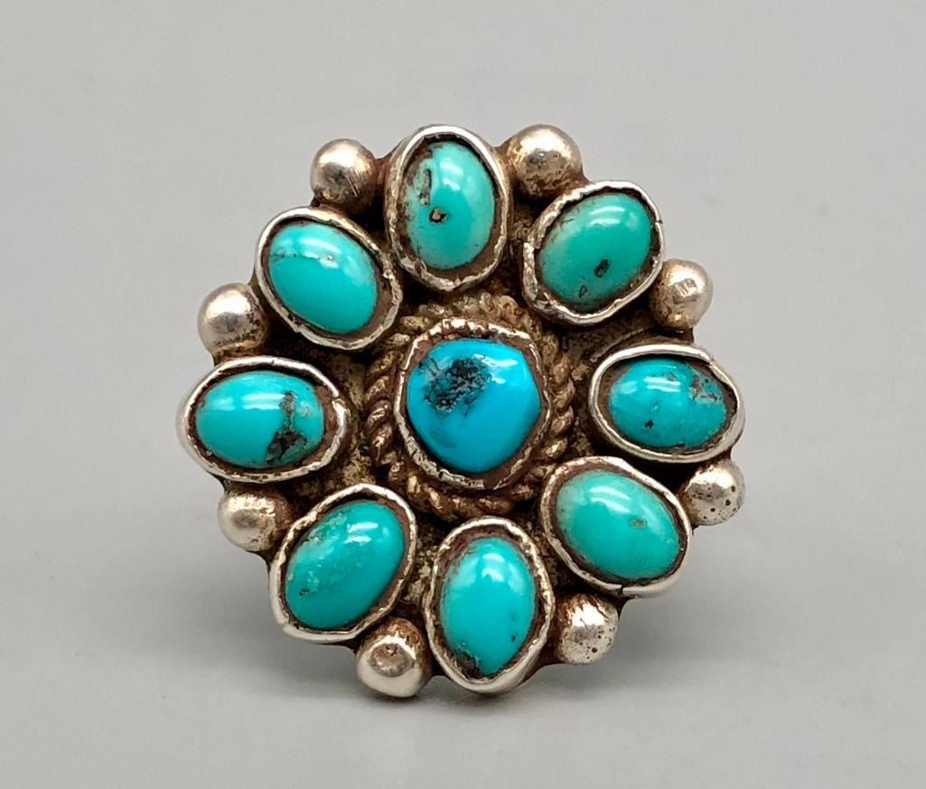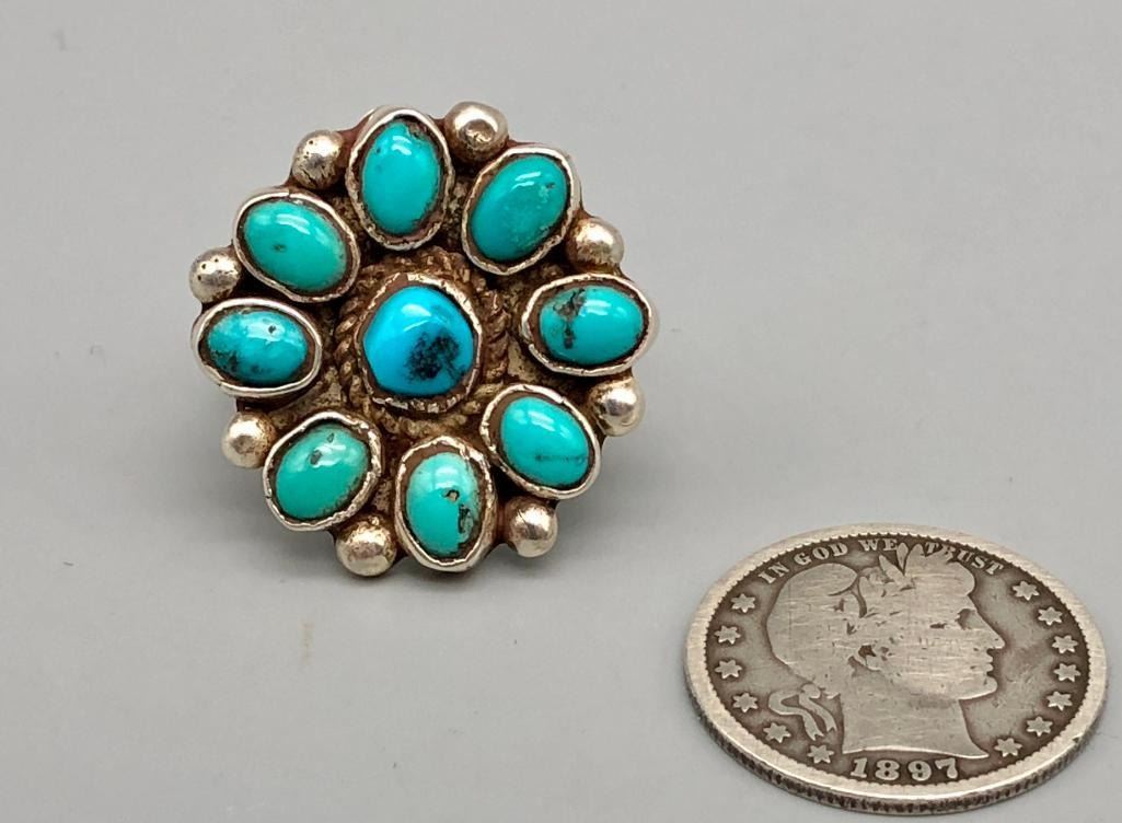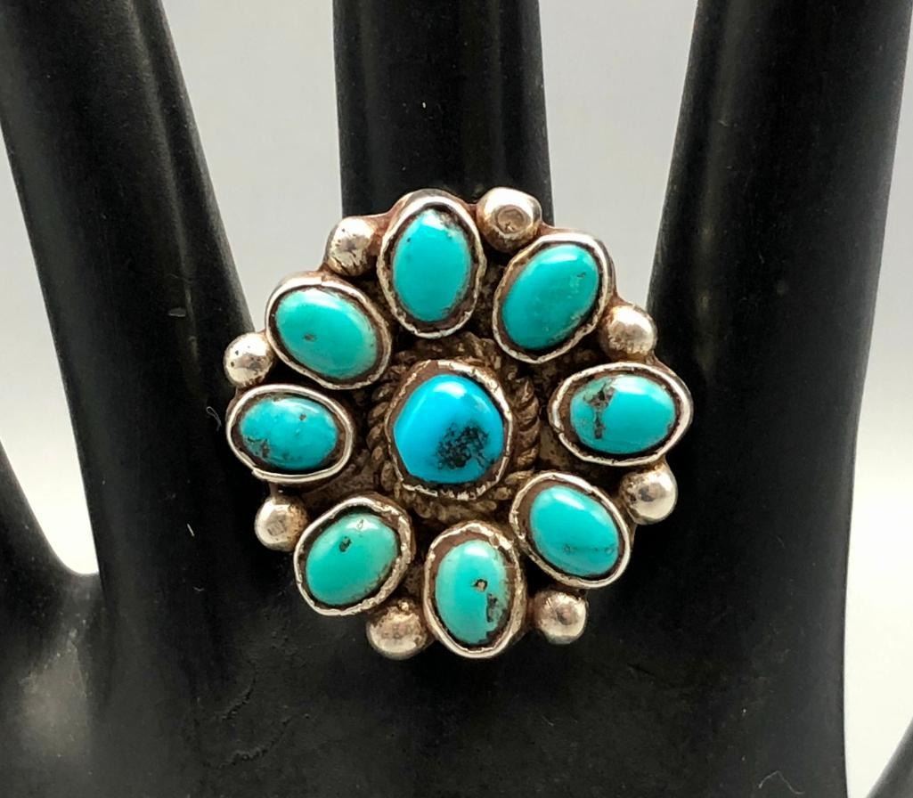 For sale in this lot is a vintage turquoise cluster ring. It is set with nine lovely turquoise stones that are accented with twisted silver wire around the center stone and silver dots between the outer settings. It is a lovely ring and is made from sterling silver. MAKER: Unmarked. APPROX AGE: Vintage. SIZE: Fits a size 11. 1-1/8 inches long X 1-1/8 inches wide. Weighs 13.1 grams. CONDITION: Good for its age, normal wear expected. Please look closely at the pictures as they are an important part of our description and are hereby incorporated into the description, specifically with regards to condition. SHIPPING: There will be a $5 handling / packaging fee for shipping this lot. The actual cost of postage will be added on top of that. BUY IT NOW: If you would like to buy this item now, without waiting for the auction day to bid on it, we do offer this option (which is available up to 48 hours before the actual auction starts). The “Buy it Now†price is the high estimate of this lot (plus applicable fees and the Buyer's premium is discounted to 10% when using the Buy it Now option). If you would like to exercise this option, you must contact us by email (or phone as long as you talk to someone live). Reference this lot number and your intention to "Buy it Now."