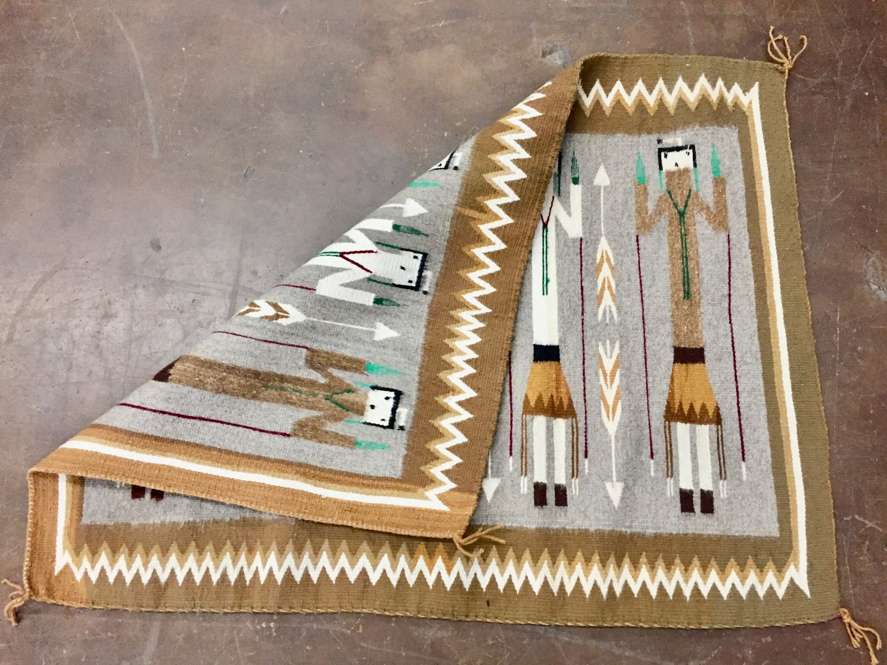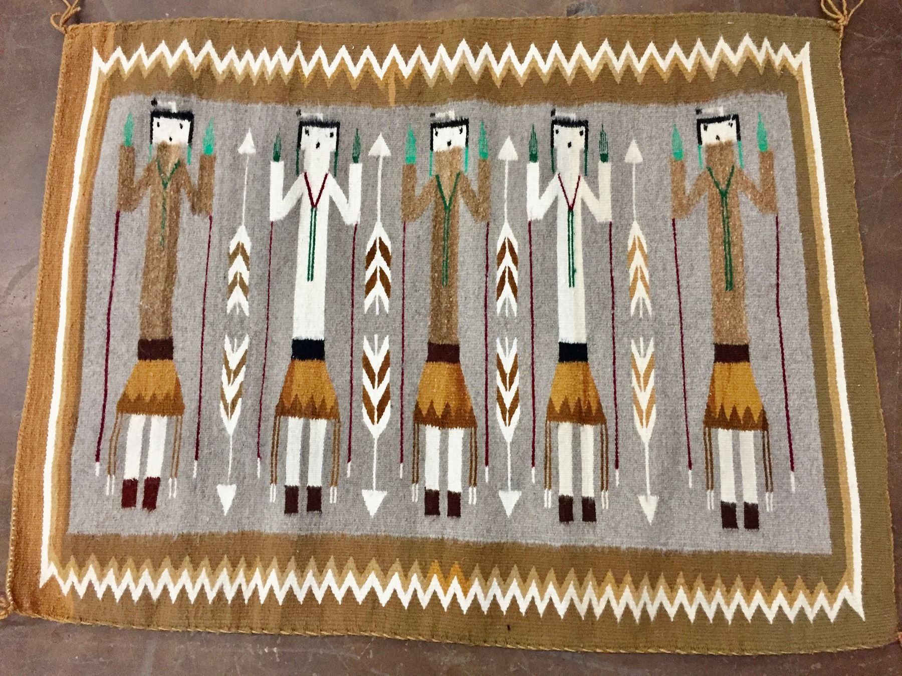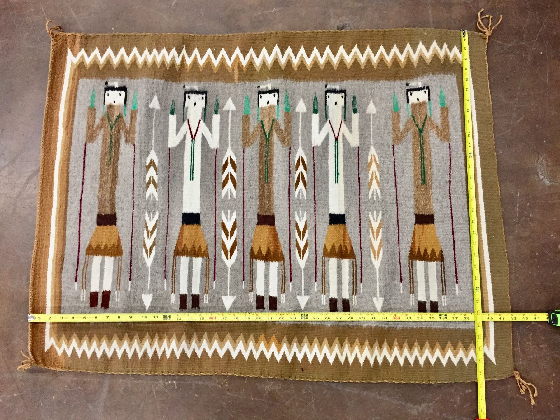 Description: Offered in this lot is a nice Yeibichai Navajo Textile featuring five figures in whites, tans, browns, grays, greens, blacks and reds.