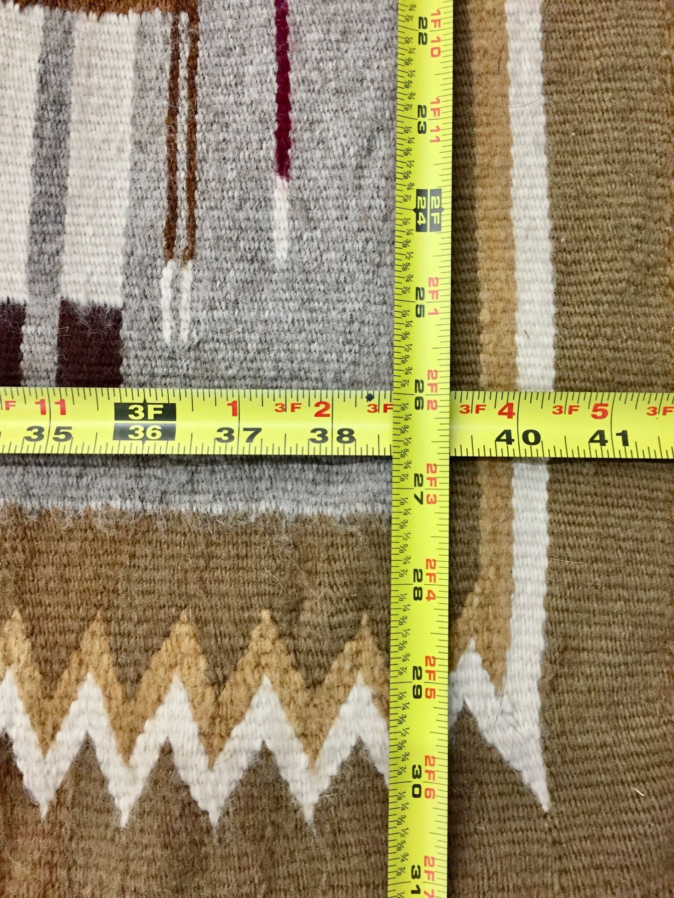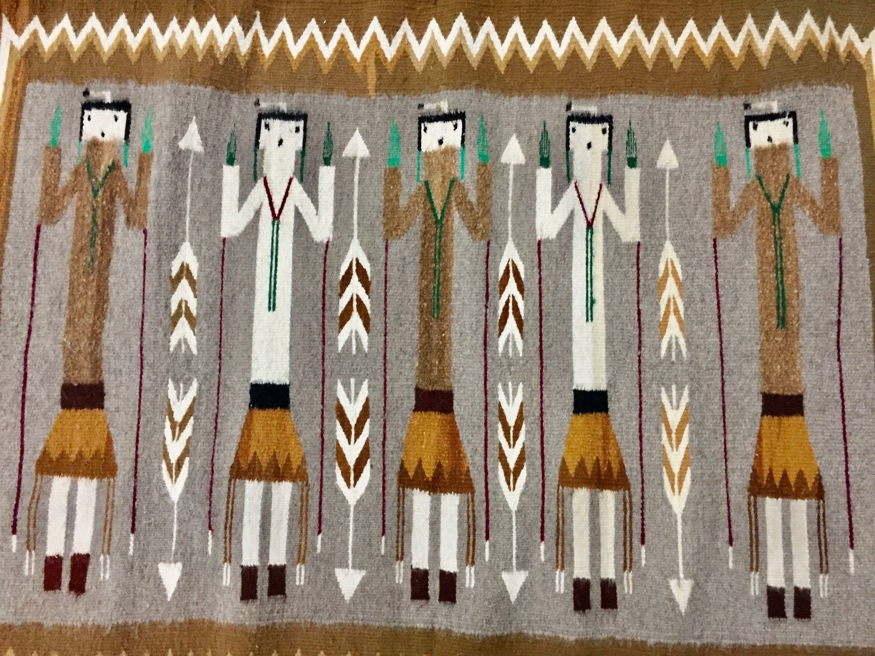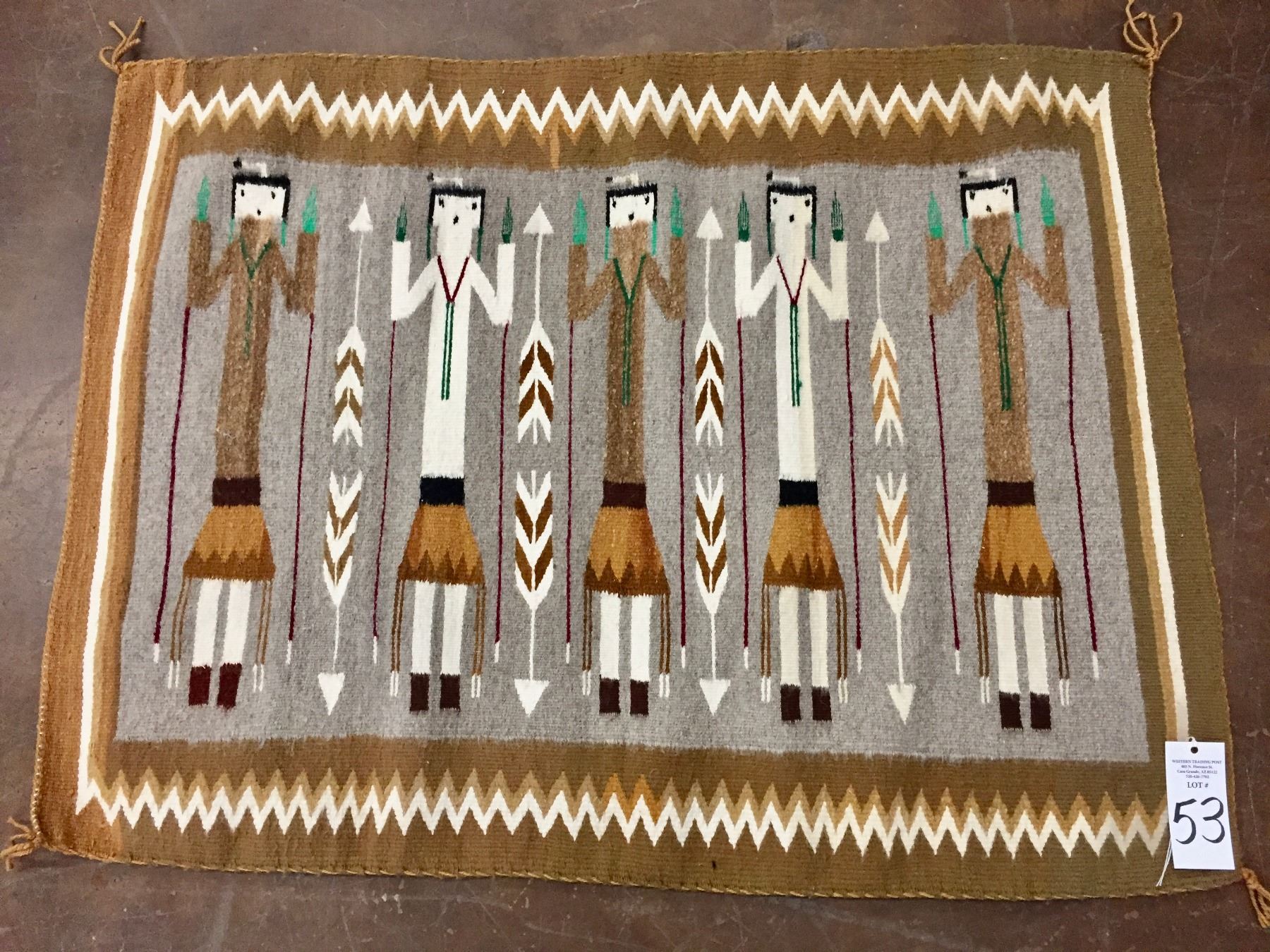 Description: Offered in this lot is a nice Yeibichai Navajo Textile featuring five figures in whites, tans, browns, grays, greens, blacks and reds.