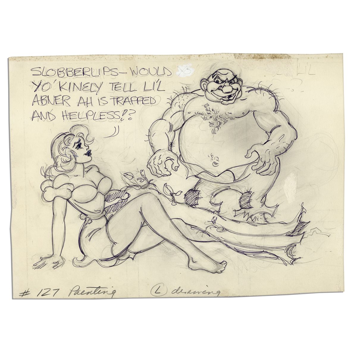 Oversized 15'' x 11'' ''Li'l Abner'' sketch by Al Capp. Drawing in ink and pencil depicts Daisy Mae and Slobberlips. With pencil notations along bottom, possibly in Capp's hand. Minor foxing and toning, very good.