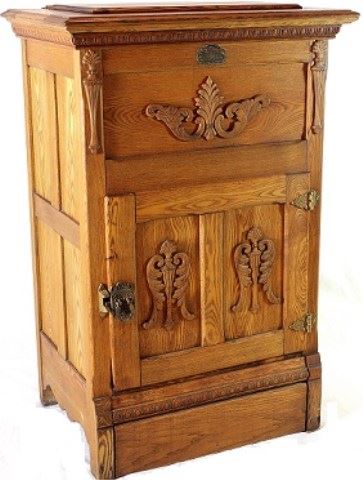 original Superior front label intact, hinged top, original brass hardware, above average example with extra trim and carvings, original and complete, 21" X 30" X 45". Est. 400-800