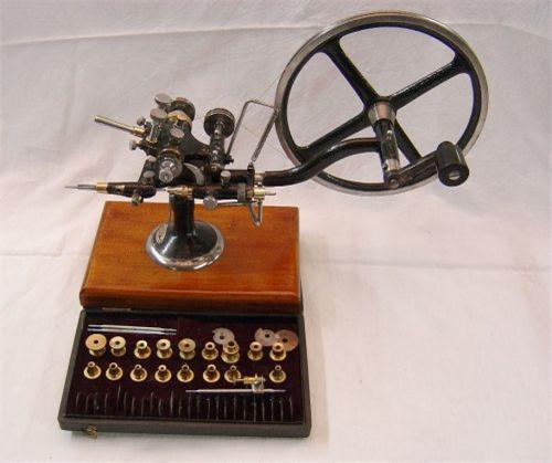 Belle machine à arrondir en fonte et bronze, signée SANDOZ ET FILS A LA CHAUX-DE-FONDS, avec coffret de tassauds et fraises, en très bon état, vers 1900