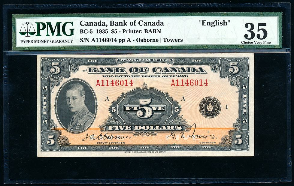 Bank of Canada, Five Dollars, 1935, English Text, BC-5, PMG VF-35. S/N : A1146014 pp A - Osborne / Towers.
