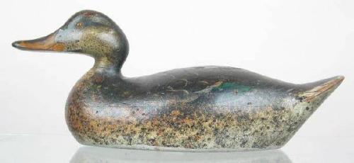 Nice early turned head Mason Factory Premier Grade mallard hen in XOP with light wear and a few tight age checks. Surface protected with a thin coat of sealer. Struck by a few shot pellets. Professional tail chip restoration. Some original filler missing in upper body check was replaced. Check ran mid-line behind the neck towards the tail for approximately5 inches. Filler replaced and T/U professionally by Steve Weaver. (decoy)
