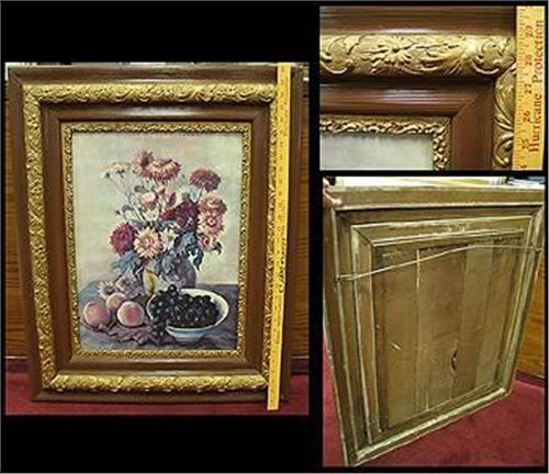 Nice heavy famed print of flowers. The frame is vintage and measures 30 1/2 by 26 1/4" and is wood with built up plaster floral work around the frame. Glass in the frame is not old.
