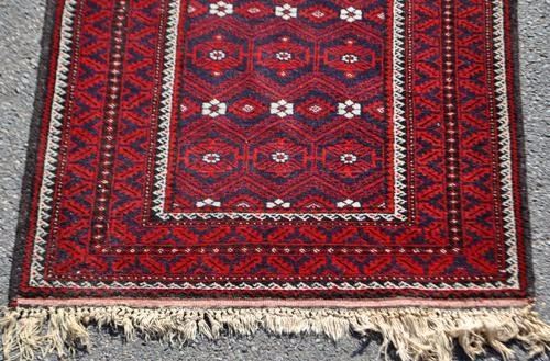 Nice looking hand woven authentic Persian Bulloch. Size 3.3 X 6.7. Made of fine quality lamb and wool pile on wool foundation, incorporating a nice looking allover medallion design and framed beautifully by an intricately done geometric border. Balouch rugs are all collectible examples of nomad art as each piece exploits the design skills and showcases the individuality of each weaver. Balouch hand-woven Rugs using beautiful vegetable dyed baluchi wools. Hand woven in Baluchistan-Iran. Size: 3 feet 3 inches X 6 feet 7 inches. Country of origin: Iran.