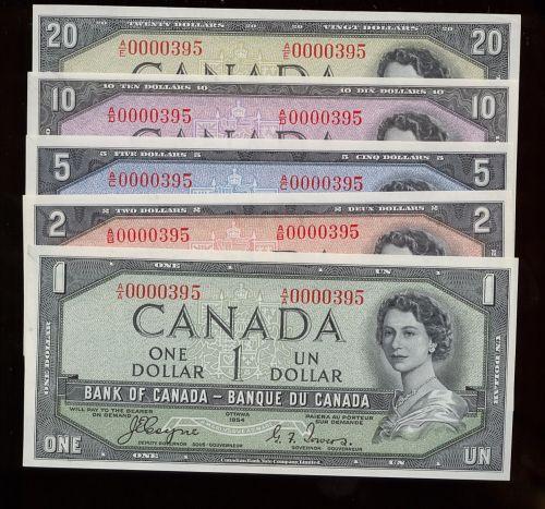 Nice matching set of 5 Devils face notes $1 through $20. All Coyne-Towers with serial #0000395 BC-29a $1,30a $2,31a $5,32a $10,33a $20. Grades vary from Unc. To Gem Unc.