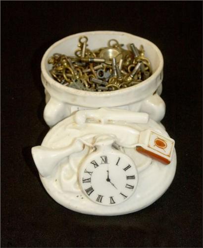 Jolie boîte en porcelaine porte-clés de montres avec environ 100 pièces, env. 1850