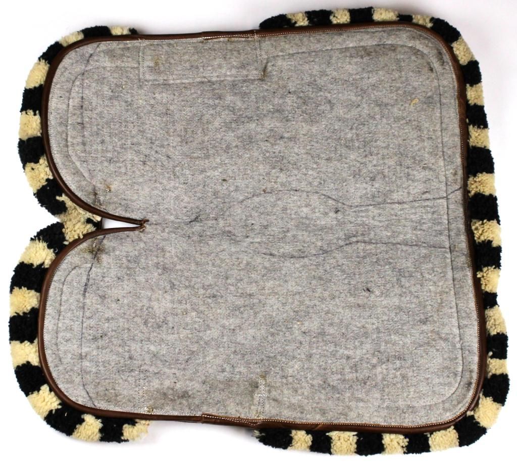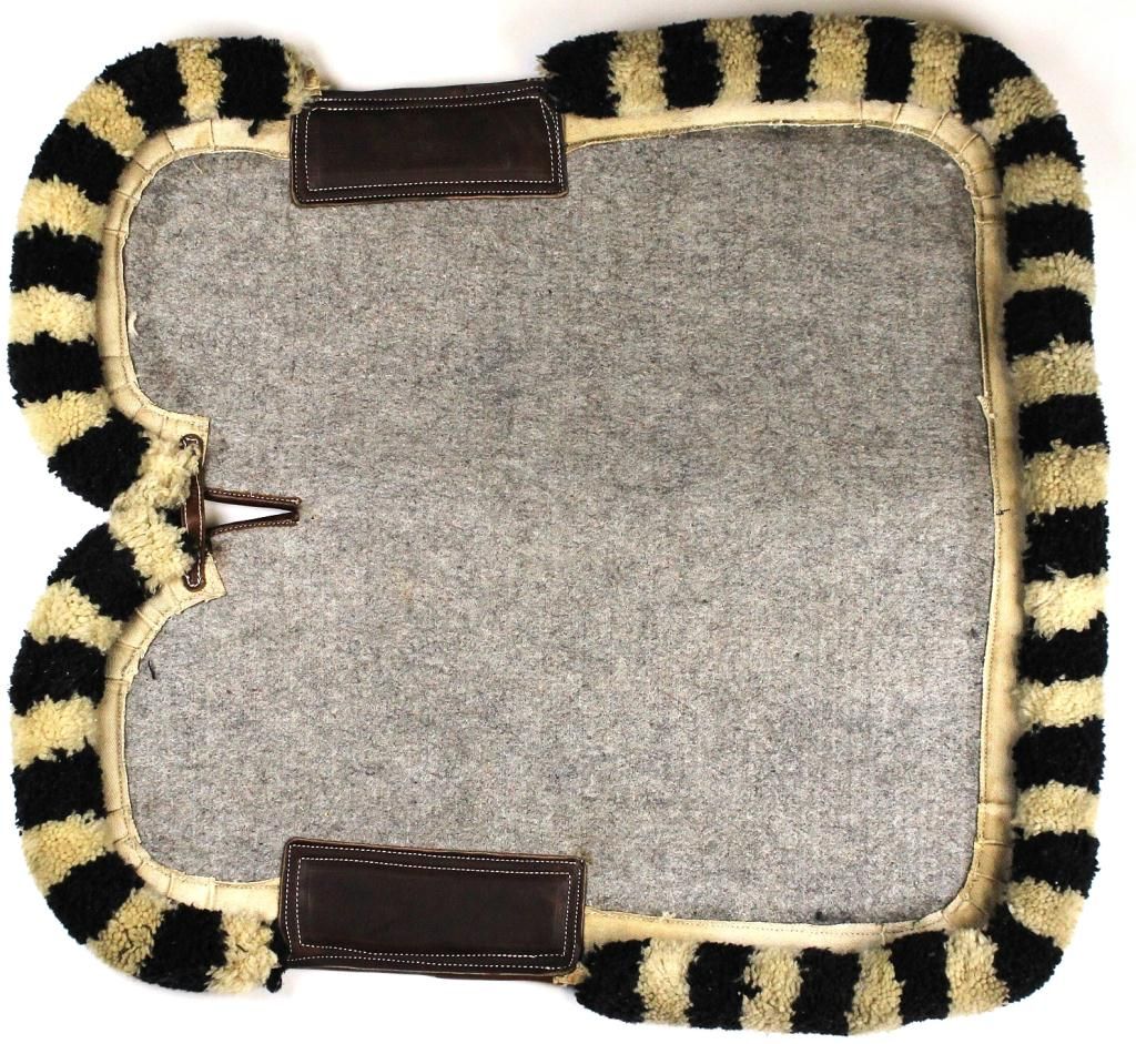 Nice quality Corona saddle pad, with alternating black and white tufted border, 23 1/3" front to back between tufting, left to right 22 1/2", shows excellent unused condition. Est. 150-300