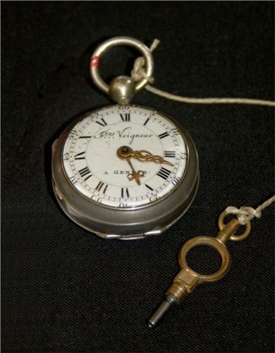 Jolie petite montre en argent, signée sur le cadran et sur le mouvement FRERES VEIGNEUR A GENEVE, échappement à verge, fusée et chaîne, env. 1800