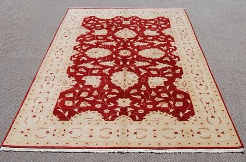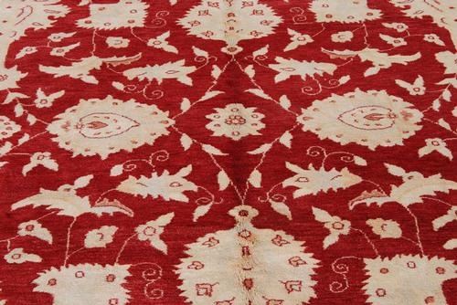 Nicely contrasted Egyptian rug. Size 6.9 x 9.4 feet, made of fine quality lamb's wool pile on cotton foundation, all natural vegetable dye, this beautiful rug incorporates a set of large floral patterns on a red background. With very rare and nicely defined colors, and encapsulated by an intricately done floral border. Hand woven in Egypt.