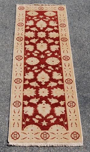 Nicely contrasted Egyptian Runner. Made of fine quality lamb's wool pile on cotton foundation. All natural vegetable dye, this beautiful rug incorporates a set of large floral patterns on a red background. With very rare and nicely defined colors, and encapsulated by an intricately done floral border. Hand woven in Egypt. Size: 8 feet 5 inches X 2 feet 7 inches.