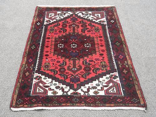 Nicely Contrasted Handmade Persian Hamadan. Made of fine quality baby lamb's wool pile on cotton foundation. All natural vegetable dye, great contrast in the variety of colors. This fine looking rug incorporates a free flowing geormetric pattern on a pale red background, A centeral large medallion, Crowned corners and celebrated beautifully by an intricately done geometric border. Hand woven in City of Hamadan from Iran. About Hamadan Rugs: Hamadan is the capital of an eponymous province, and it's one of the oldest cities in Persia. It's also one of Persia's most productive and diverse weaving centers. Over the years, many refugees, minorities and ethnic groups have inhabited the area. Like other cities in the western part of Persia, Hamadan produced fine, coarse carpets that are made with the symmetric Ghiordes or Turkish knot. Due to the sheer number of villages in the province of Hamadan and the area's ethnic diversity, many unique designs are featured in these regional Rugs. Traditionally, Hamadan has been a center for commercial carpet production. The fragmented ethnic groups that have historically lived in Hamadan include Kurds, Azeri Turks and Islamic people. Antique Hamadan Rugs traditionally favor angular designs although large-scale arabesques and curvilinear motifs are also found. They are closely related to Rugs produced in the neighboring areas of Bibakabad, Shiraz, Lilian and Dozens of cities that produce local styles. Size: 4 feet 11 inches X 3 feet 2 inches. Country of Origin: Iran.