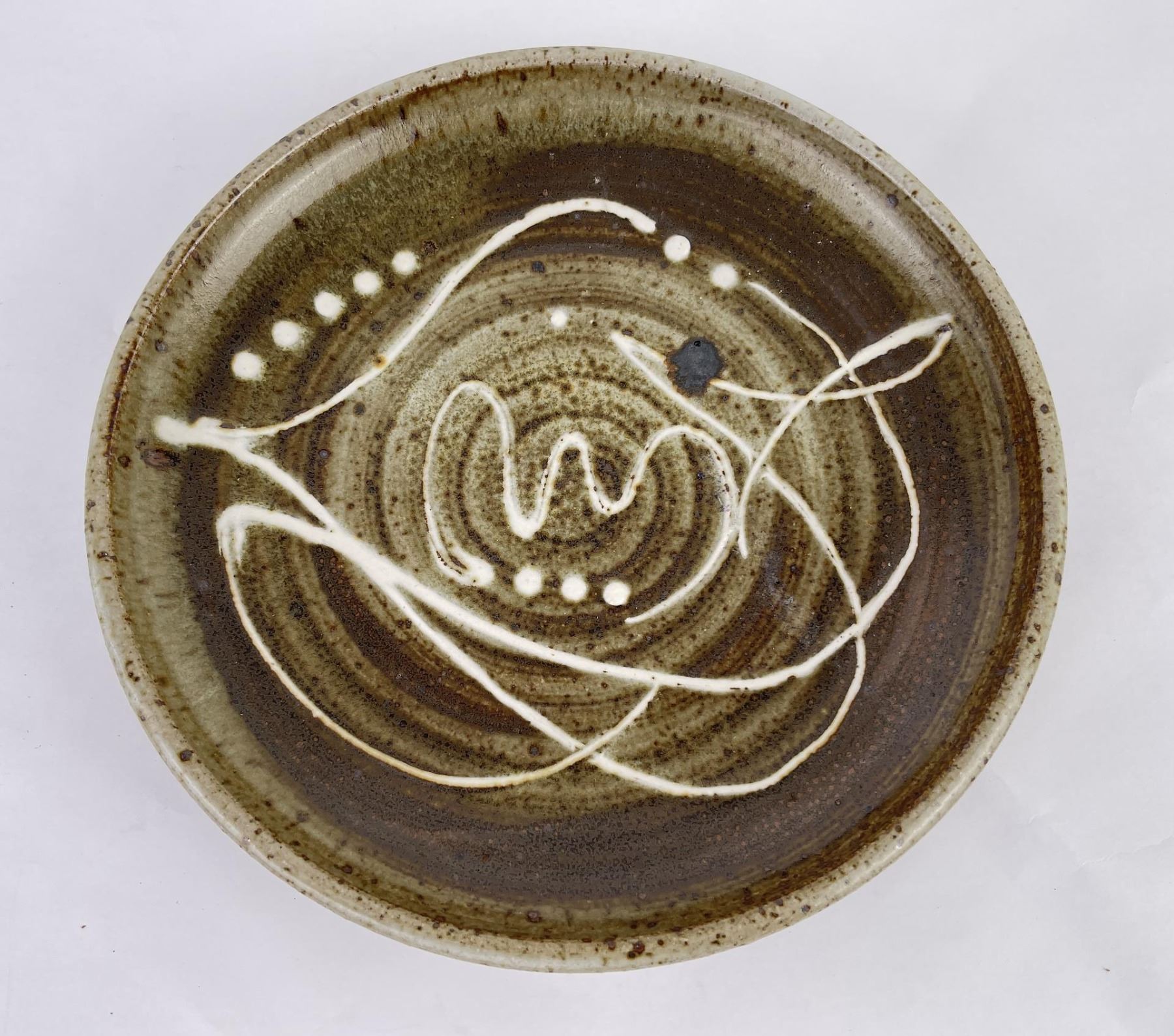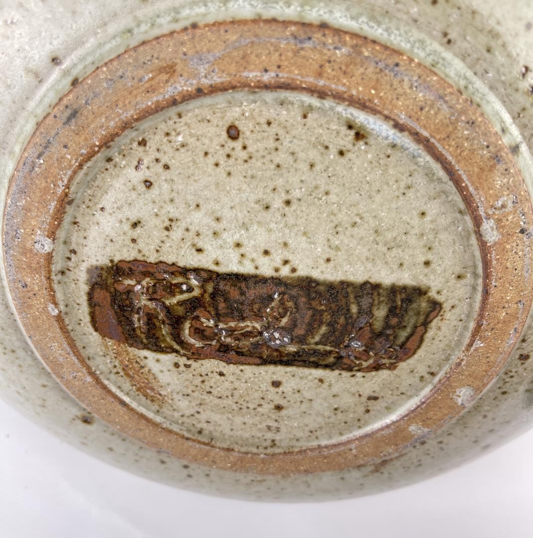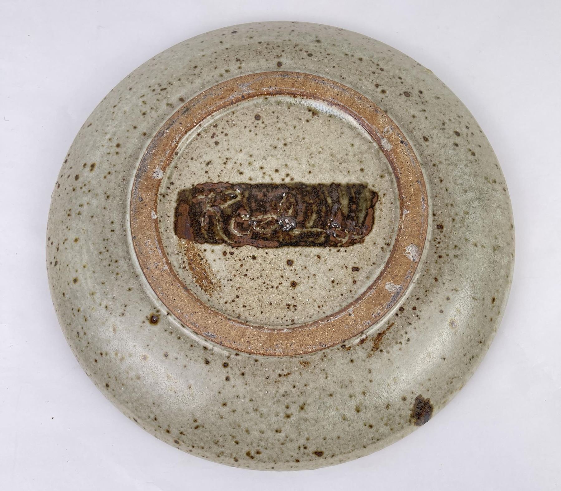 Signed as shown. Illegible. Very finely made. Definitely a skilled potter. 11" diameter.