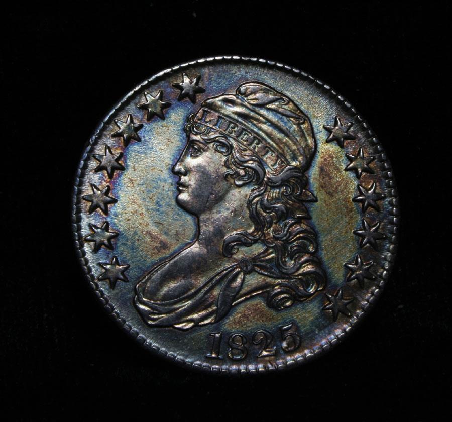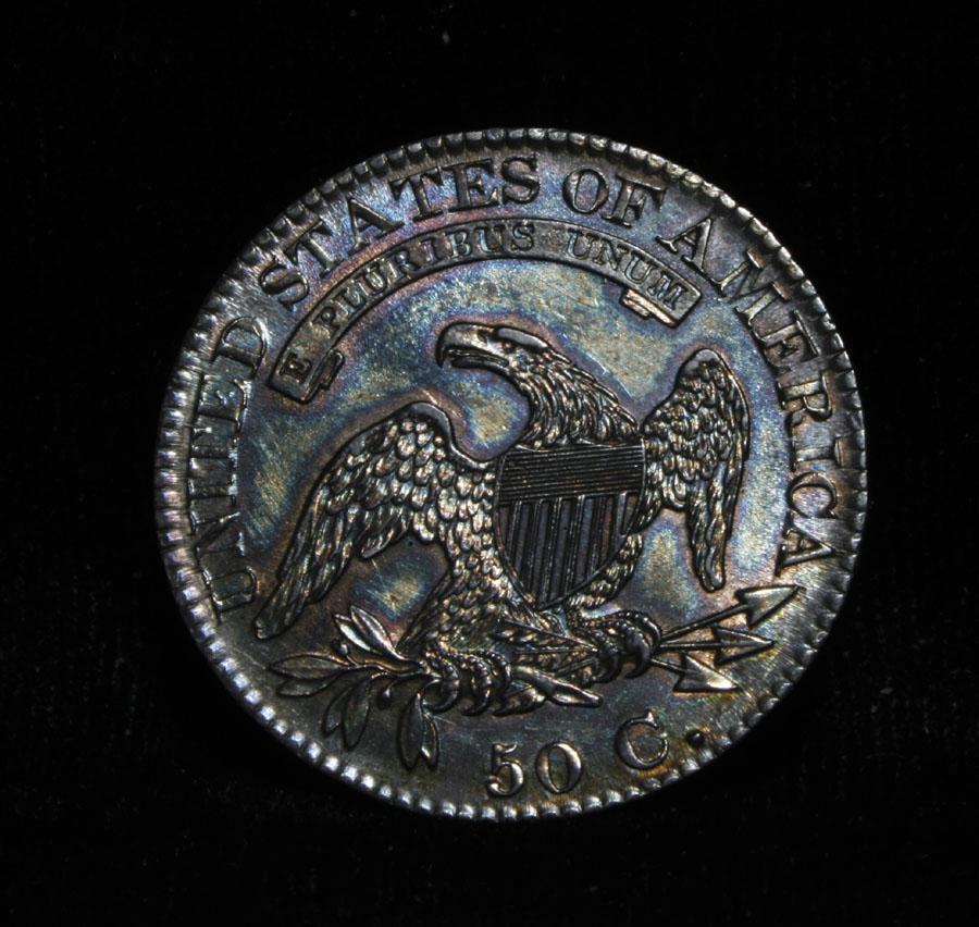 Beautiful Deep Toned Capped Bust Half Dollar. It is a Great Lustrous example, with fantastic all deep colorful toning. A superior example. Coin World's Coin Values lists an untoned example grading ms63 at $3000 and The Wholesale Greysheet lists a non toned example grading ms63 at $1800. Estimated Value $2000