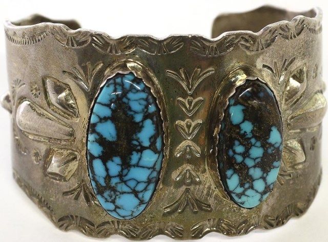 in sterling silver set with 2 turquoise stones, hallmarked Sheila Tom, 1 1/2' wide. Est. 300-500
