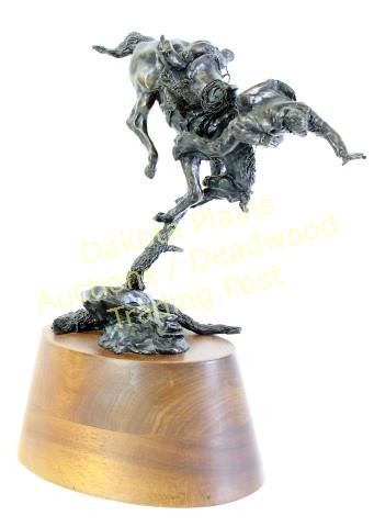 Nicely accomplished bronze "Surprise"by Nebraska born artist Herb Mignery b. 1937, 13 1/2" tall with walnut base, includes 2012 appraisal by artist for $4200.