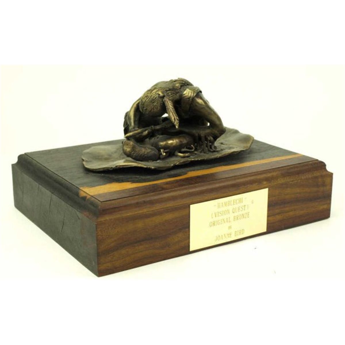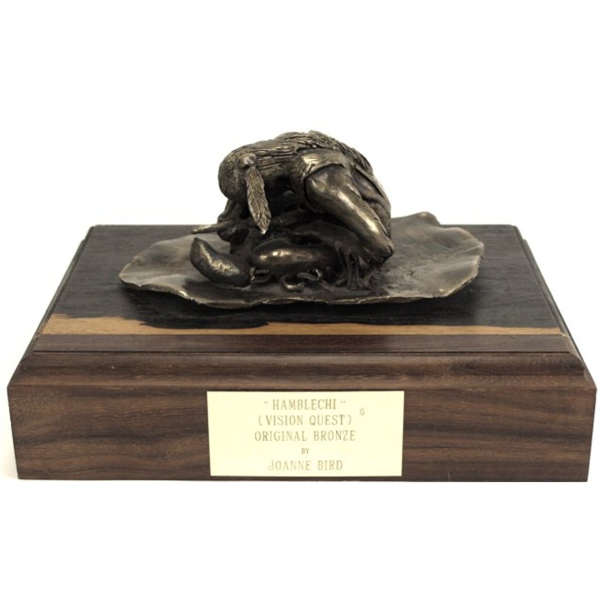 Nicely accomplished sculpture "Hambletchi" (Vision Quest) by noted SD artist Joanne Bird, 8 1/2' long X 3 1/2" tall, mounted on hardwood base 12" X 9".