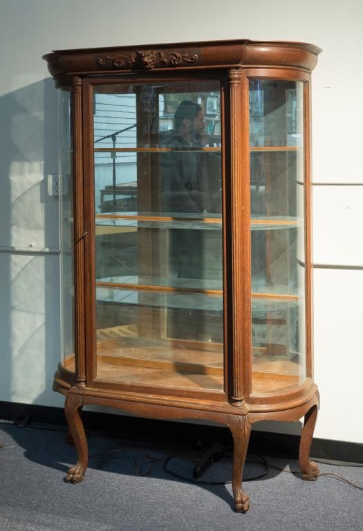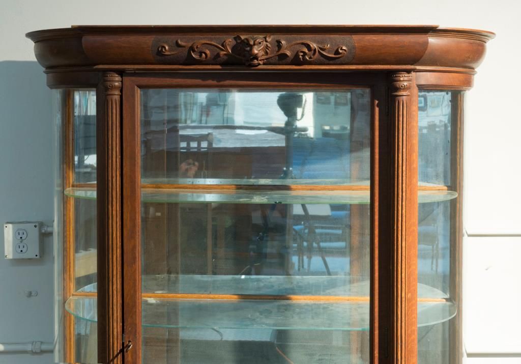 Nicely carved American Walnut Curio Cabinet circa 1880 – turn of century. Great Lion and Scroll work at center. Very good plus condition. Bowed glass side galleries. 70” in Ht by 46” wide by 17” deep. Est.: $700 - $1400.