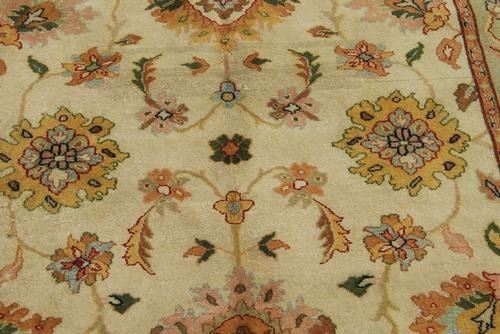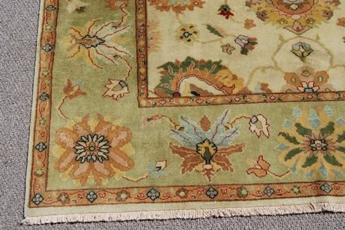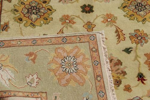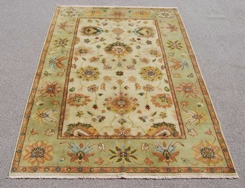 Nicely contrasted Egyptian Rug. Size 6 feet 1 inches X 9 feet 1 inch. Made of fine quality lamb's wool pile on cotton foundation, all natural vegetable dye, this beautiful Rug incorporates a set of large floral patterns on Ivory and light green background. With very rare and nicely defined colors, and encapsulated by an intricately done floral border. Hand woven in Egypt.