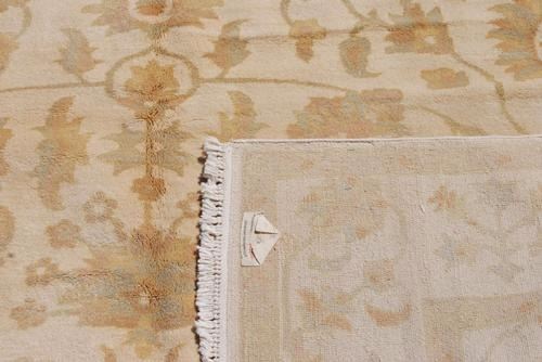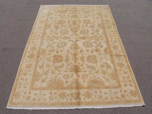 Nicely contrasted Egyptian Rug. Made of fine quality lamb's wool pile on cotton foundation, all natural vegetable dye, this beautiful rug incorporates a set of large floral patterns on a ivory background. With very rare and nicely defined colors, and encapsulated by an intricately done floral border. Hand woven in Egypt. Size 6 feet 9 inches X 10 feet.
