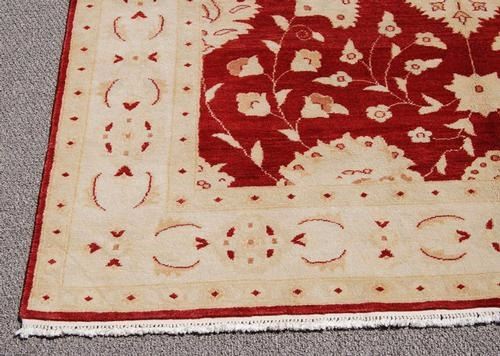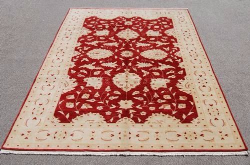 Nicely contrasted Egyptian Rug. Made of fine quality lamb's wool pile on cotton foundation, all natural vegetable dye, this beautiful Rug incorporates a set of large floral patterns on a red background. With very rare and nicely defined colors, and encapsulated by an intricately done floral border. Hand woven in Egypt. Size: 6 feet 9 inches X 9 feet 4 inches.