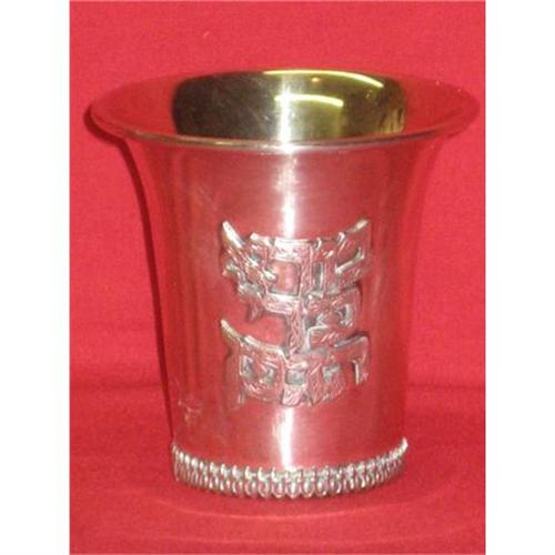 This is a very nicely done Sterling Silver Kiddush Cup/beaker with the delicate decoration on the bottom rim and Gold plated interior and marked sterling by Netafim. It is in excellent condition. H:2.75"- W:2.75" on the top. Weight: 2.5 OZ