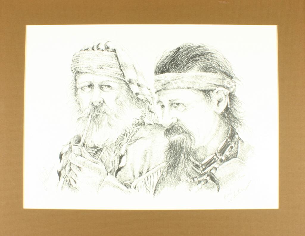 Nicely framed and matted etching by Vic Riesau of two mountain men approx. 17” x 21”. Est.: $100-$200.
