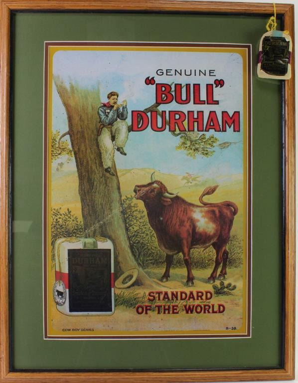 Nicely framed and matted reprint Bull Durham Tobacco print, depicts Treed cowboy wait out the bull, image size 20" X 14". Includes original bag Bull Durham Tobacco.Tobacco print, depicts Treed cowboy wait out the bull, image size 20" X 14". Includes original bag Bull Durham Tobacco.