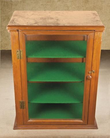 Nicely made 4-tier display cabinet, approx. 25” in height by 19” wide, by 11-1/2” in depth. Lined in green felt with brass hardware, antique style, probably orange-stained southern pine. Great for displaying memorabilia. Est: $75 - $150