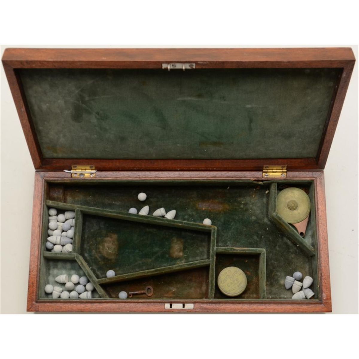 Nicely made modern green material-lined wood presentation case for a Colt Model 1860 Army percussion revolver in overall very good to fine condition showing beautiful graining to lid with some minor storage scratches, brasshinges and lock escutcheon, cast lead balls, a reproduction cap tin and reproduction capper. Est.: $100-$150.