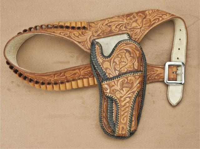 Nicely tooled western style cartridge belt and matching holster marked S.D. Myres, El Paso. Belt for 5-1/2” single action, 38-40 size, .45 caliber cartridge loops. The holster and belt show their light original color and are in good condition, one loop split from age and use. Est: $300 - $600