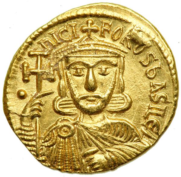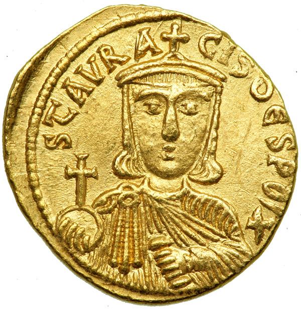Nicephorus I, 802-811. Gold Solidus (4.40 g) minted at Constantinople. Bust facing of Nicephorus I holding cross potent and akakia. Reverse: Bust facing of Stauracius (son of Nicephorus I) holding globus cruciger and akakia. D.O. 2c; S. 1604. Scarce. Small fault from the minting procedure on obverse, 1:30 o'clock. Lustrous, Extremely Fine.