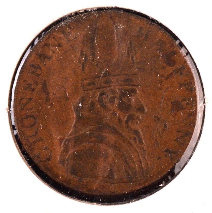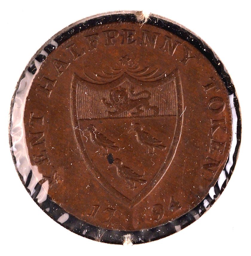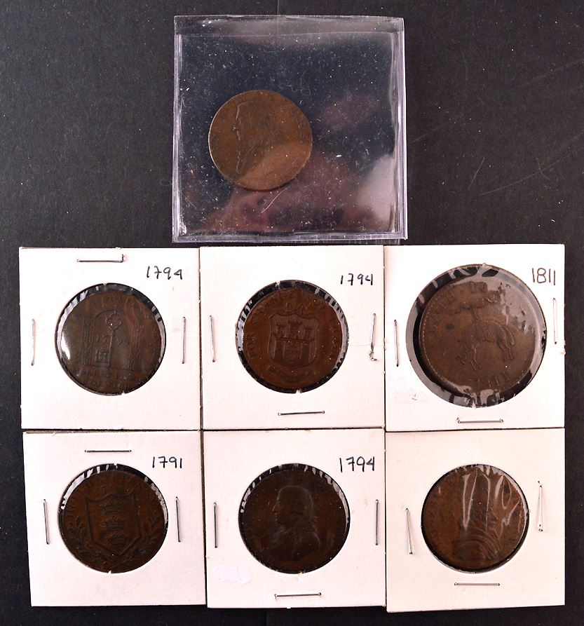 Great Britain, Half Penny tokens, Chicester & Portsmouth, 1794; Hull, 1791; Kent, 1794; Norwich, 1794; Ireland, Cronebane HalfPenny, ND; John Howard, No Date, Unc; Bath, Penny, 1811; All VF to EF, unles specified; total 7 pcs.