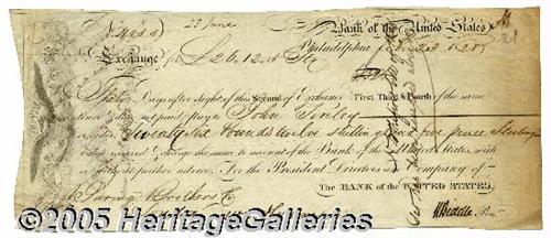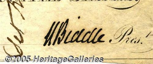 <B>Nicholas Biddle Signed Draft as President of the Bank of the United States</B></I> Partly-printed document signed, measuring 9.4" x 3.9", dated Philadelphia, February 23, 1828, a sight draft for <B>ritish pound symbol 26 12s 5d directing that, "Sixty Days after signed of this Second of Exchange (First third & Fourth) of the same tenor & date, not paid) pay to John Finely or order... value received & charge the same to account of the Bank of The United States with or without further advice for the President Directors and company of Baring Brothers & Co., London..." With a crisply engraved vignette of an eagle and shield at left. Slightly yellowed at right, light creases, but otherwise in excellent shape with a very dark signature. In addition to his work in banking, Biddle wrote the definitive history of the Lewis & Clark expedition. <I>Accompanied by COA from PSA/DNA.</B></I>