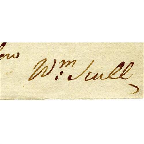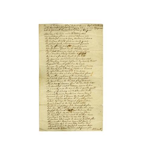 <B>(Nicholas Biddle) William Scull, Philadelphia mapmaker, Autograph Manuscript Signed,</B></I> "<I>Wm Scull</B></I>" one page, 7.25" x 12.25", no place, no date. A poem entitled "<I>Verses to the Memory of my beloved cousin Capt. Nic[ola]s Biddle of the Randolph frigate of 36 guns blown up in an Engagement with the Yarmouth British man of War of 64 guns.</B></I>" The poem reads in part: "<I>What dread Explosion rends the distant Skies | What sulphirous [sic] flames in Spiral Volumes rise | The Randolph Swims No More, Modest and brave | The Virtious Biddle finds an early grave | ... Such was thy wish, Mysterious heaven deny'd | Deserved success to Crown thy Noble pride | Oer power'd by double force, the Trembling Main | Beheld thy Ship the Unequal fight Sustain | Amaz'd behl'd the British bands retire ... Confess'd thy Naval Skill and thundering Power | ... all haste to bind the Youthfull [sic] Wariors [sic] brow | With Wreaths Whose Verdure Shall forever glow</B></I>" Nicholas Biddle (1750-1778) was one of the first five captains of the Continental Navy. He spent much of 1775 off the coast of Newfoundland capturing British merchant ships. In June, 1776 Congress gave him command of the 32-gun Frigate <I>Randolph,</B></I> built in Philadelphia and launched in early 1777. On March 7, 1777 the <I>Randolph</B></I> encountered the 64-gun Ship HMS <I>Yarmouth.</B></I> Instead of fleeing in the face of a superior foe, Biddle chose to fight. After a twenty minute engagement, the <I>Randolph</B></I> exploded killing all but four of the 310 men aboard. This proved to be a serious blow to the fledgling Continental Navy. William Scull was a third-generation mapmaker, who during the American Revolution served in the Geographical department of the Continental Army. Slight partial fold separations, a few minor soiled spots, else fine condition. A touching, evocative tribute to one of this country's first fallen heroes. From the Henry E. Luhrs Collection. Accompanied by LOA from PSA/DNA.